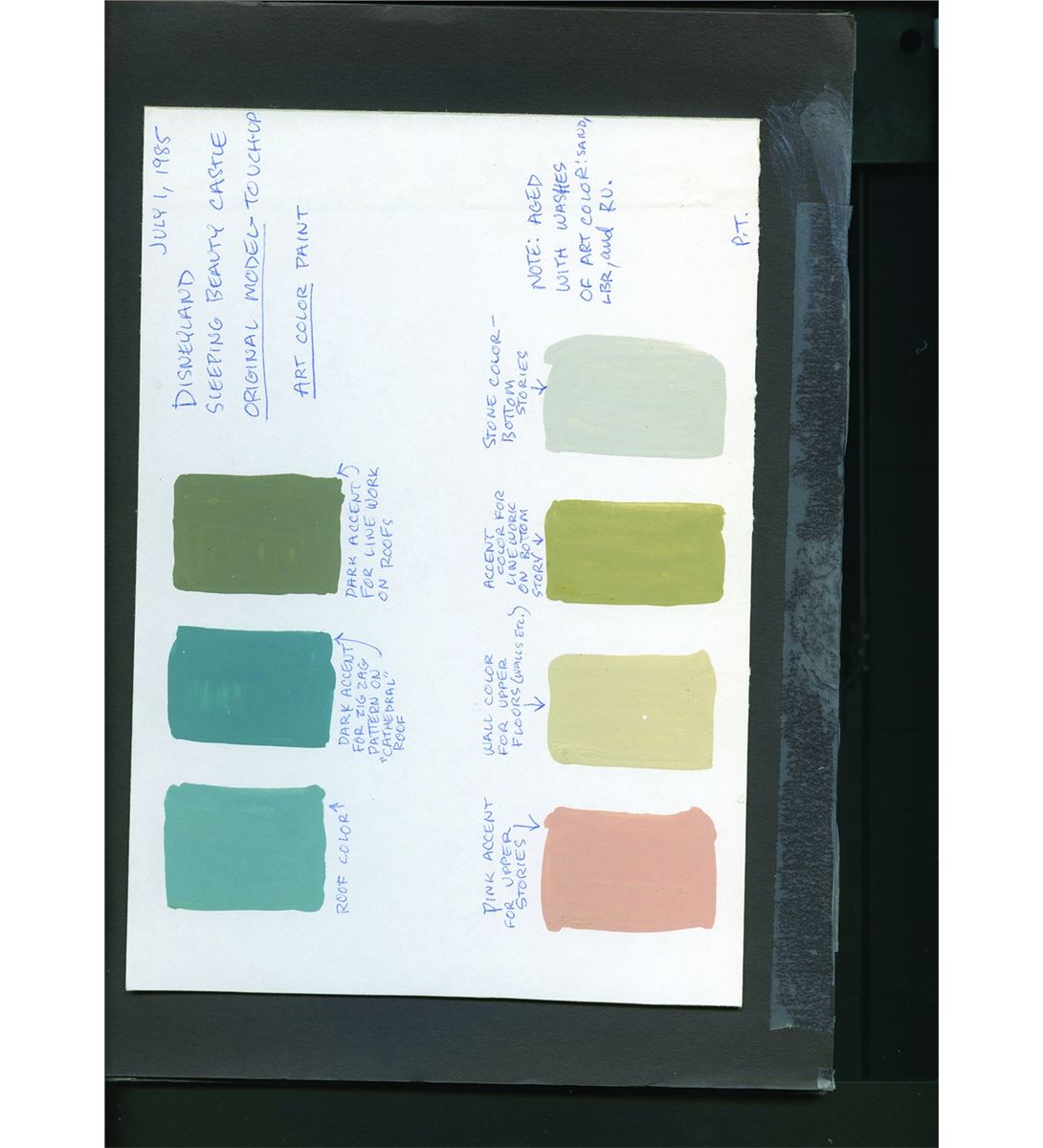 (Disneyland, 1985) Beautiful 3-ring binder with reference photos of the restoration of the original model of Sleeping Beauty’s Castle by Imagineer John Stone in 1985. The binder includes paint samples for