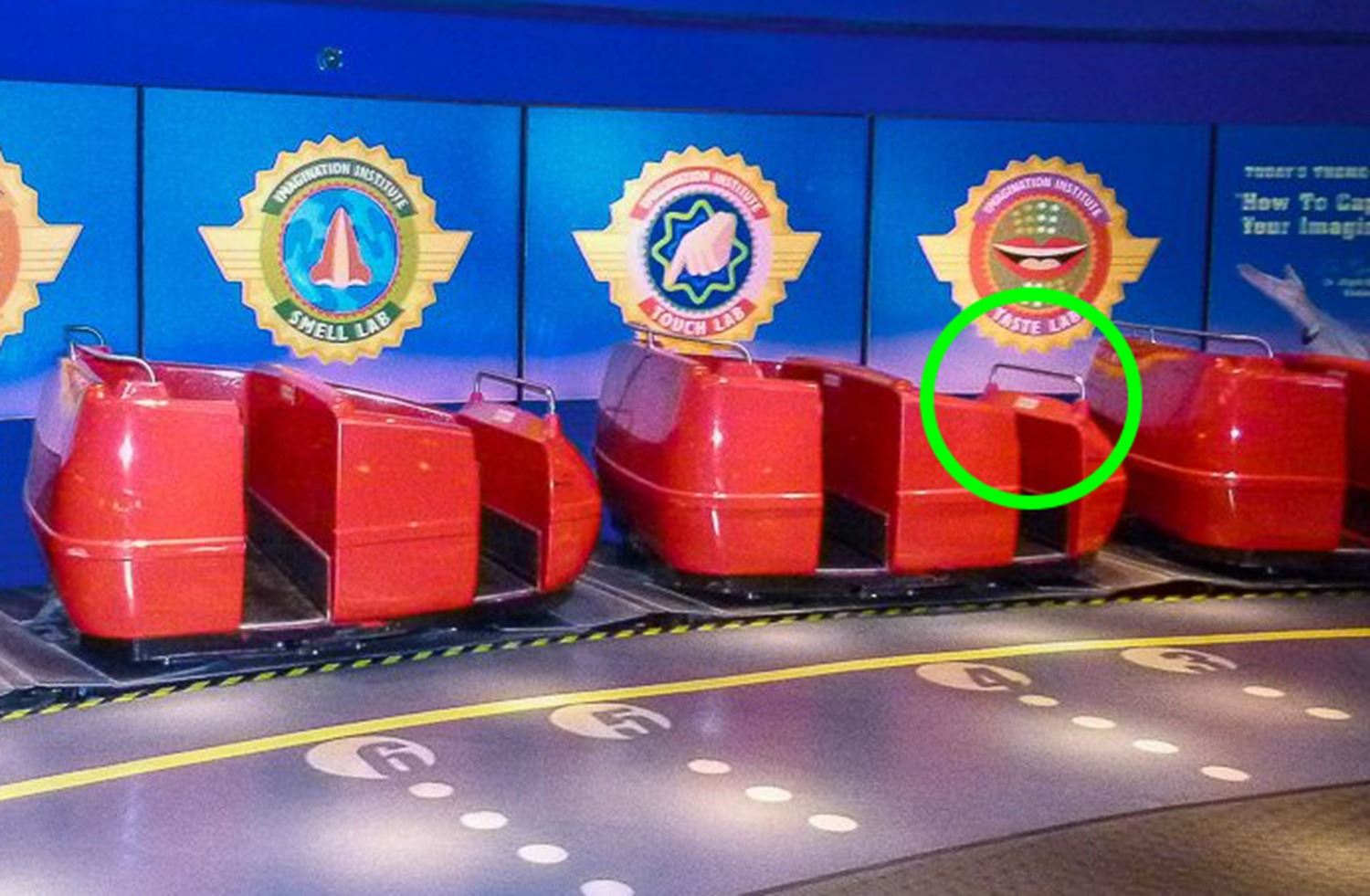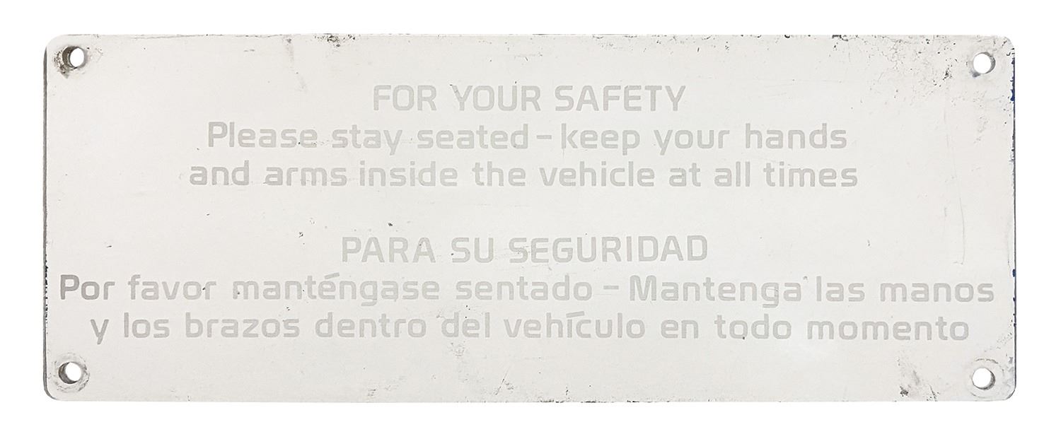 (Epcot, c.1990s) A ride vehicle safety sign used in the original incarnation of the Journey into Imagination attraction at Epcot. The translucent acrylic sign warns guests to stay seated with hands and arms inside the vehicle in both English and Spanish. Measuring 3.75"x.9.75", the sign is in good park-used condition, with scraping and scuffing to the surface from use. There is a moderate amount of paint and other residue around the edges, likely from vehicle maintenance.