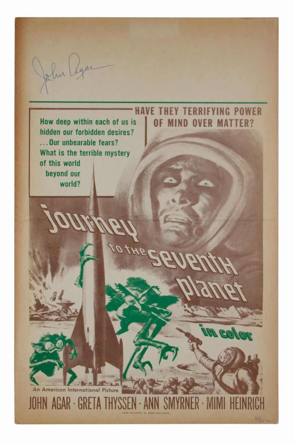 (AIP, 1962) An extremely rare original U.S. duotone window card poster for Journey to the Seventh Planet by the Benton Card Company. The playdate field is signed in blue ballpoint pen at left by star John Agar. Measuring 22"x14", the poster is in good condition with a central horizontal crease, browning in the margins, pencil notation at bottom right, creasing to the corners, and minor edge wear.