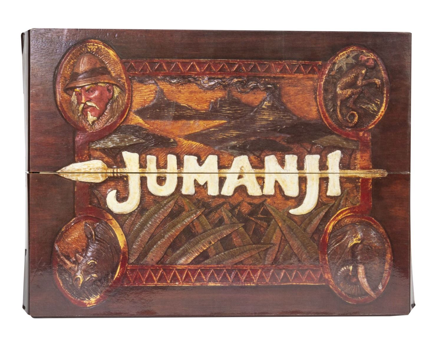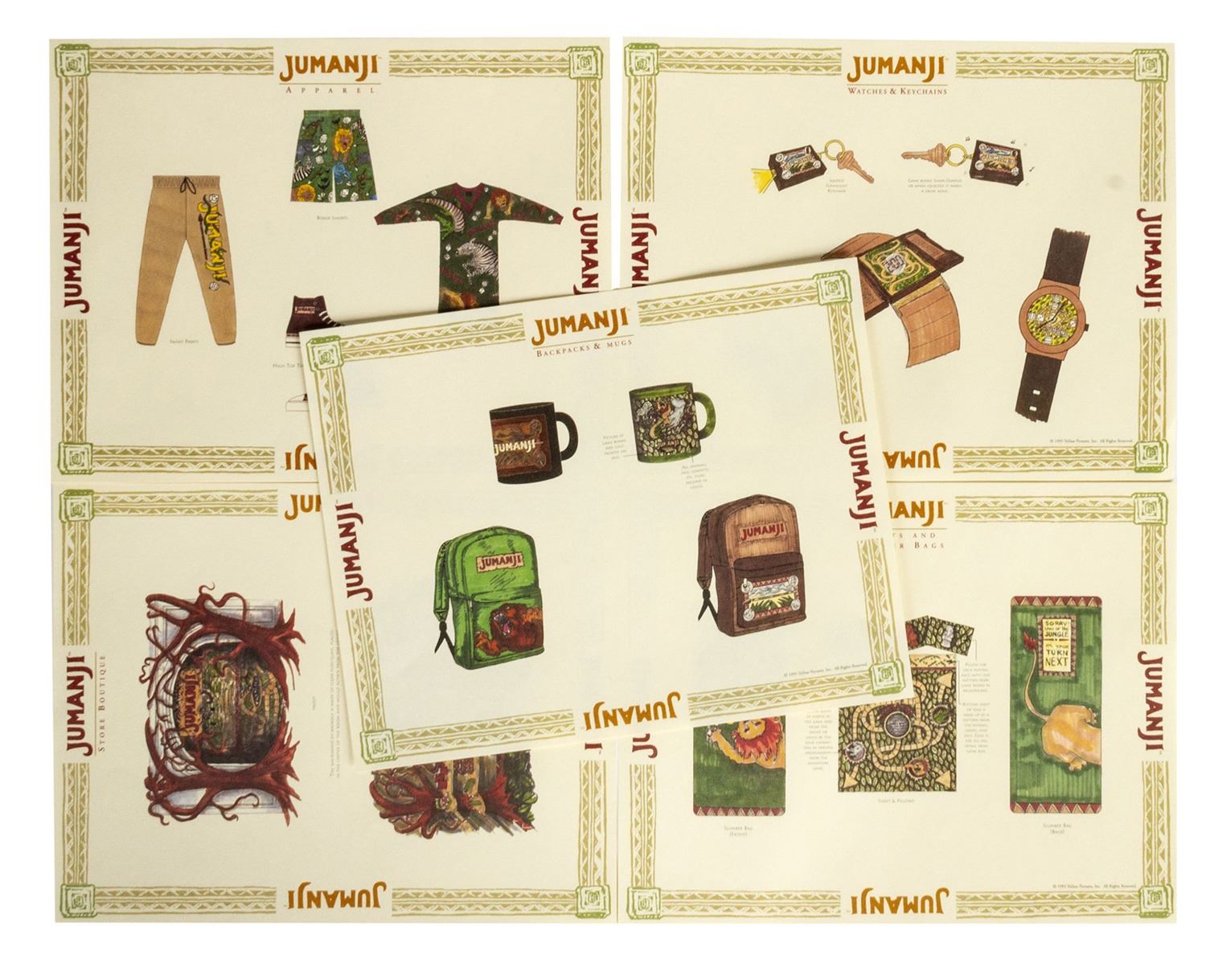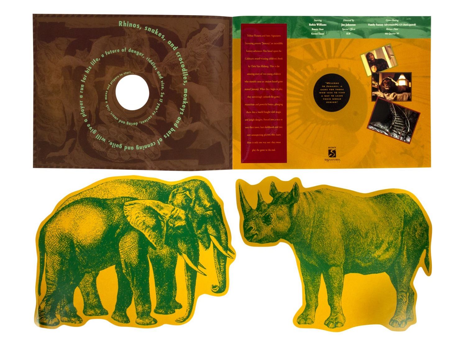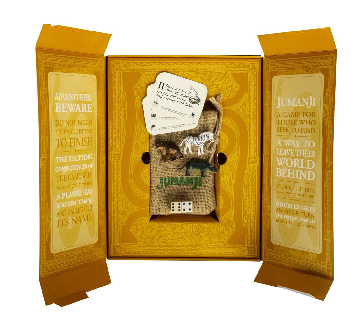 (TriStar, 1995) A promotional gift in the shape of the board game seen in Jumanji. This promotional gift features an outer folded paper board game case, which opens to reveal (5) pages of sample merchandising concepts for the film, (2) animal shaped biography and summary sheets for the film, a production summary folder, a Jumanji burlap bag with (2) dice, (3) mock playing cards, and (2) animal figures inside. The overall box dimensions are 9.25"x12.25" and 1.25" thick. The condition is good with some creasing and minor wear from use and storage.