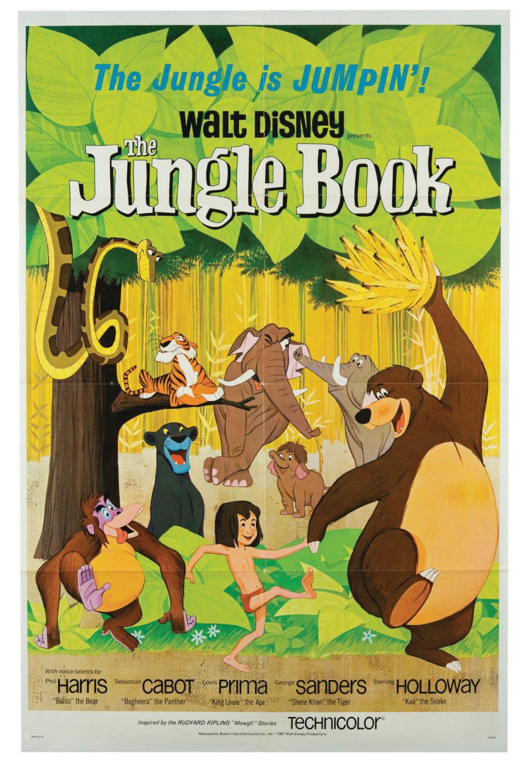 (Disney, 1967) An original release one sheet poster for The Jungle Book. Original release one sheets are very sought after for this popular animated feature. Measuring 41"x27", the poster presents in very good condition, with few creases, minor wear to edges and corners, and pinholes from display.