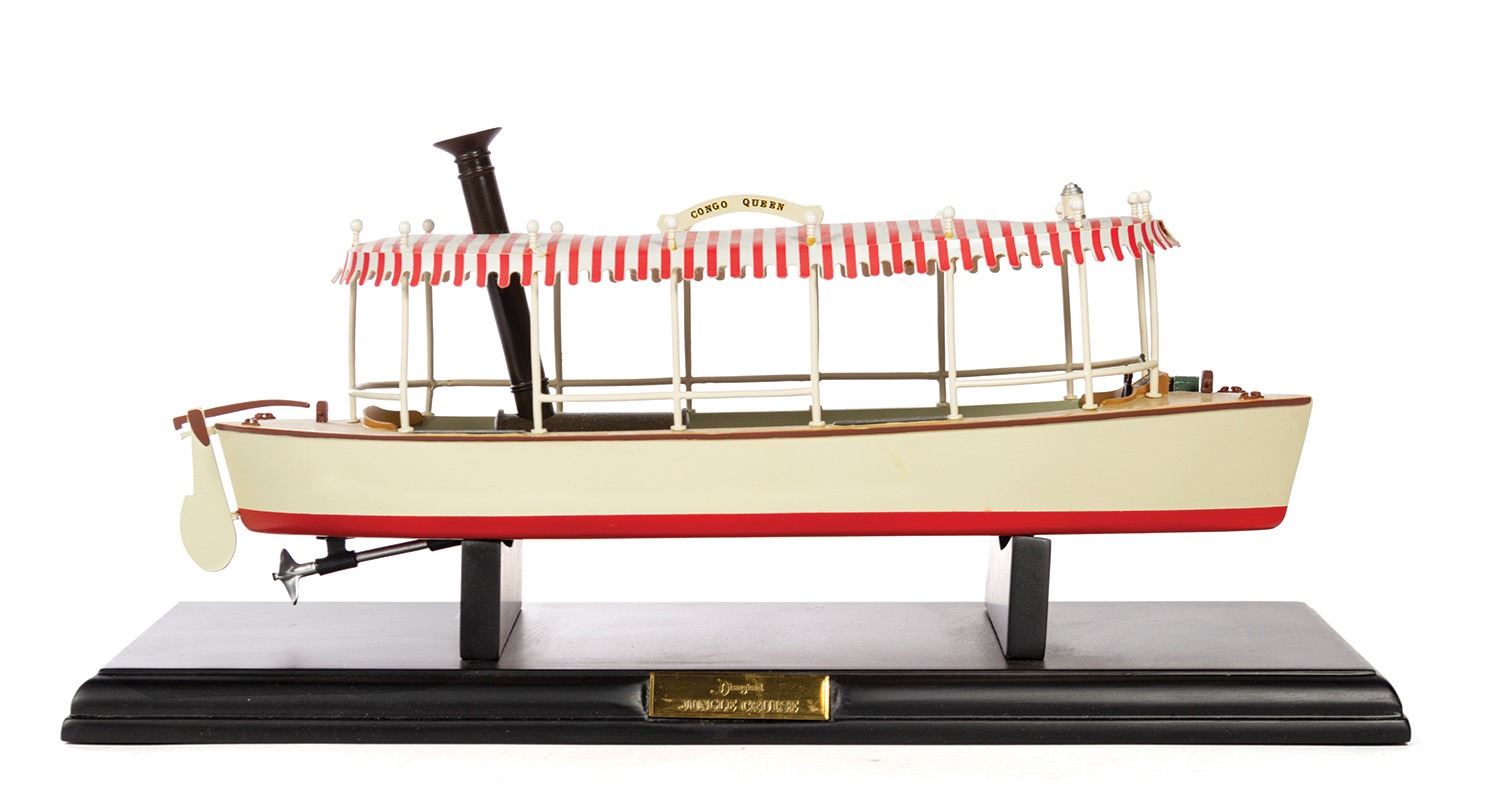 (Disneyland, 2005) A limited edition replica of a boat from Disneyland's Jungle Cruise attraction. Sculpted by Richard Allsmiller and William Babington as part of the 50th anniversary of Disneyland, the replica was produced in an edition of only 1,500 pieces. Measuring 6"x 15.5" and 7" tall, the boat is in very good condition. The edge of the canopy reveals a slight amount of the adhesive. Includes the original Certificate of Authenticity.