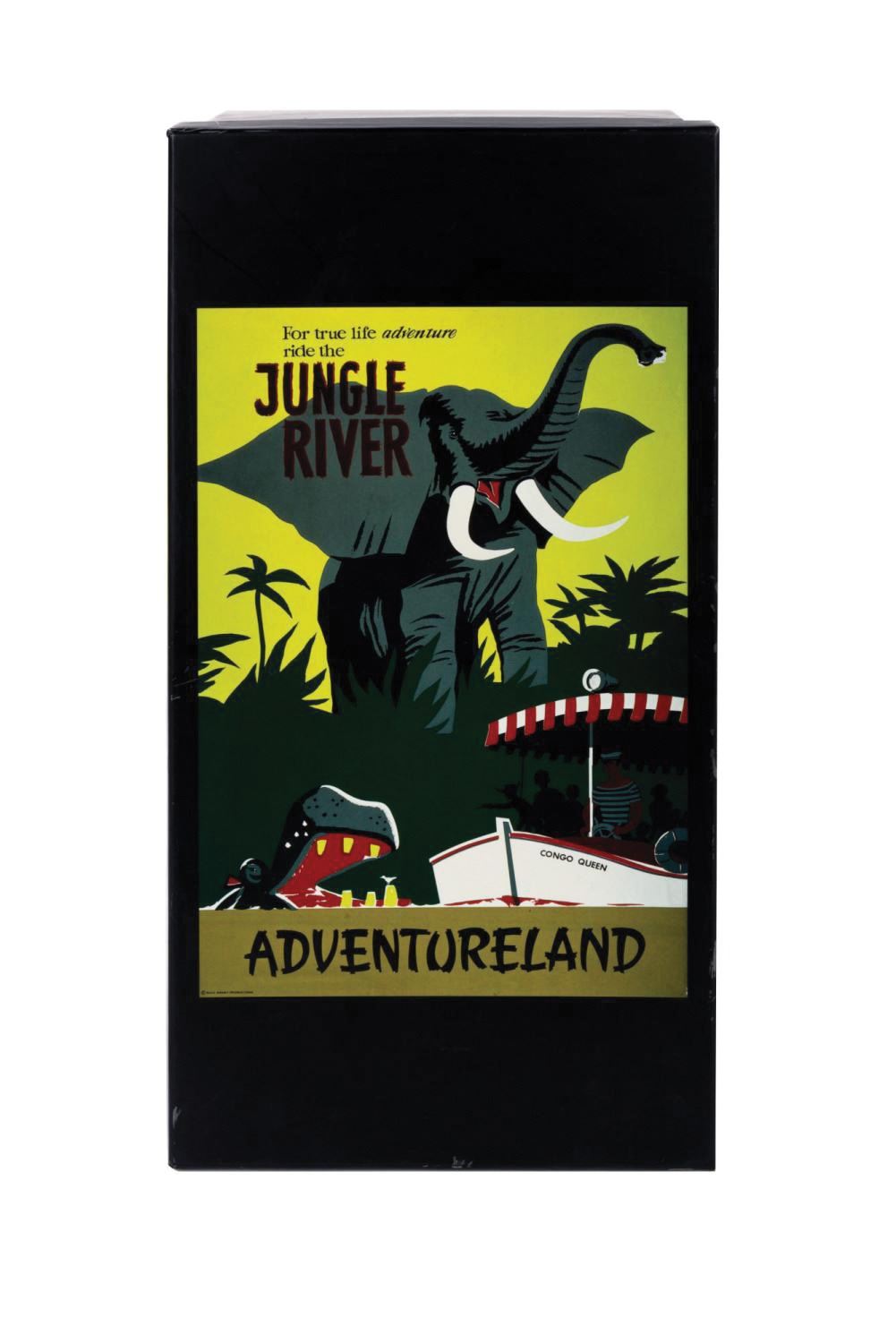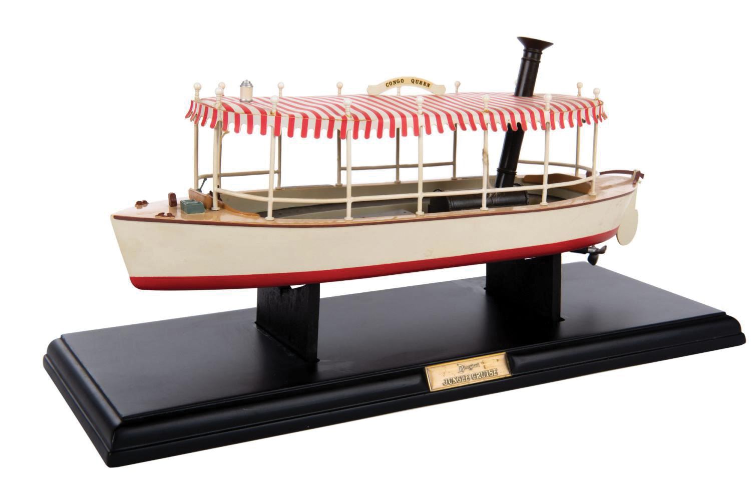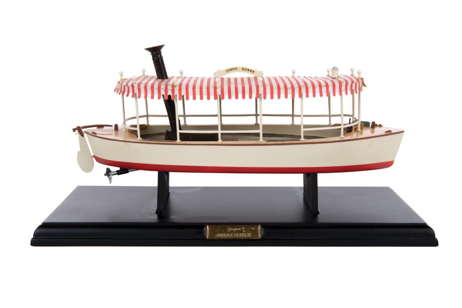 (Disneyland, 2005) A Jungle Cruise Congo Queen limited-edition replica by Kevin Kidney & Jody Daily. Created in celebration of Disneyland's 50th anniversary, the model was released in an edition of 1000. The miniature-scale boat has been crafted from resin and metal, with a striped silk-screened vinyl canopy. Measuring 14.25" long, 4.75" wide and 5" tall (from hull bottom to top of boiler funnel), the model is proudly displayed on a 16.75"x6.5" matte black base. The model is in very good condition with minor surface wear. The support brackets on the base were replaced and glued in place. While the original box is included, the modified base will not be packed in the box with the model.