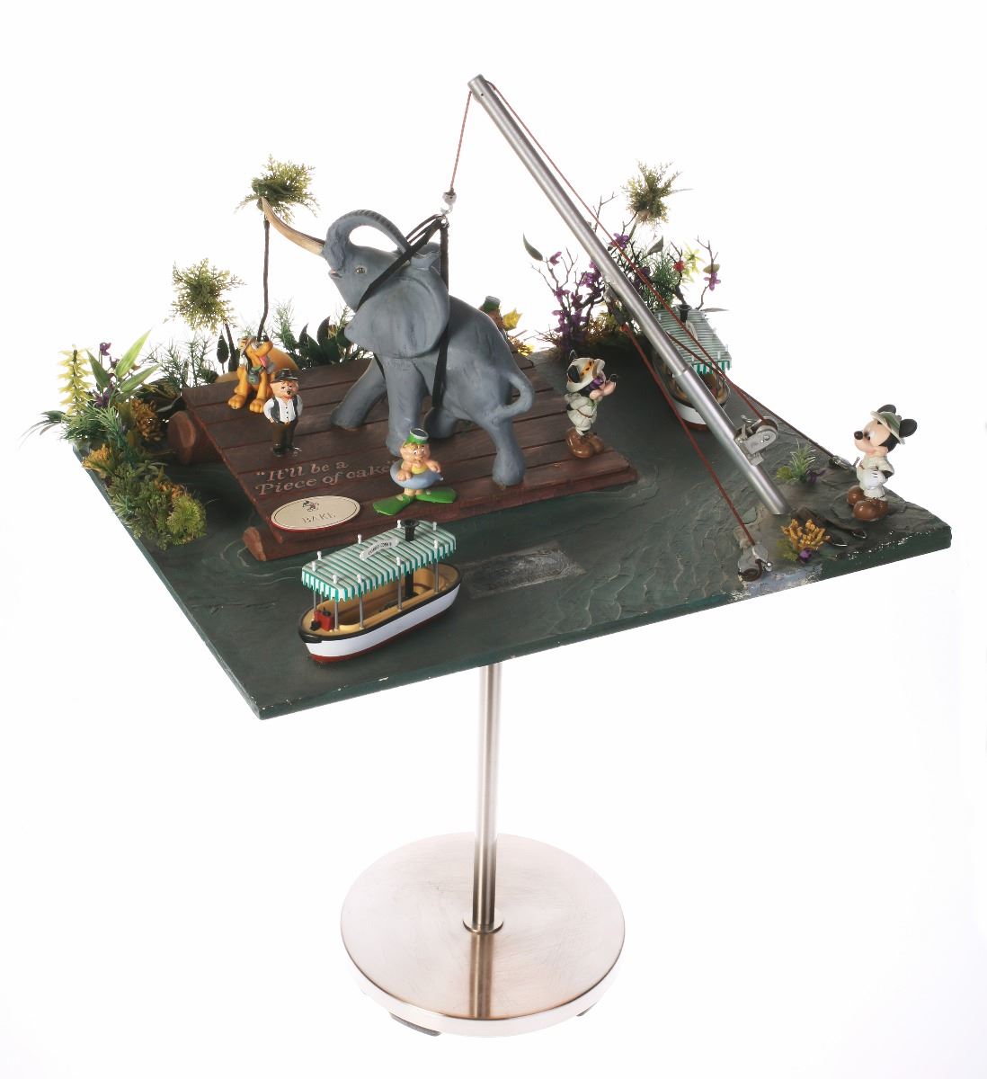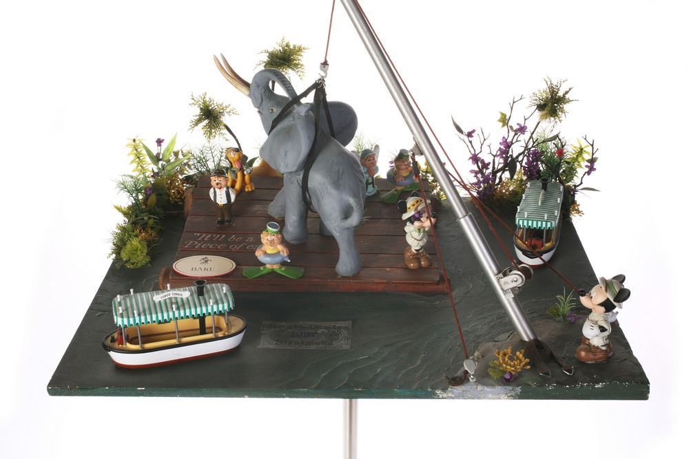 (Disneyland, 1987) Custom made gift for "Bake" Baker who designed the rig and the overall plan to remove the Bull Elephant from the "Jungle Cruise" attraction for maintenance after more than 20 years of operation. Created by Baker's coworkers in the Maintenance Shop, this one-of-a-kind gift commemorates a significant moment in the attraction, and was created by the talented individuals who kept the park running during its earliest of years. Measures 23"x18.5" and 30" tall. In very good condition with many small and humorous details.