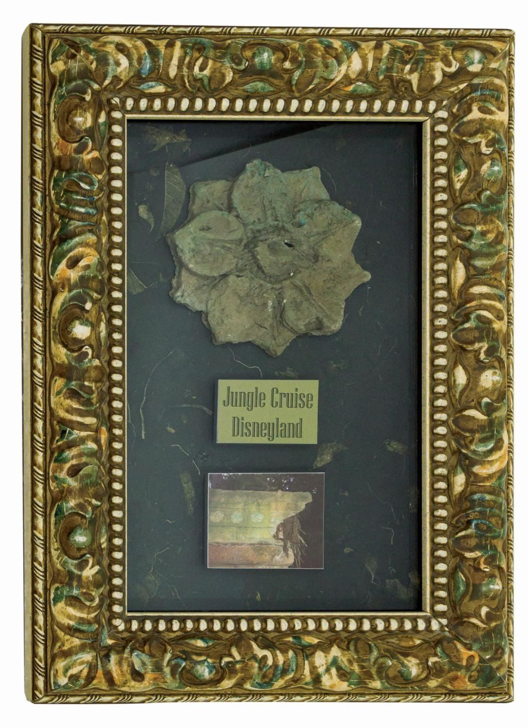 (Disneyland, c.1990s-2000s) An original flower carving prop from the Jungle Cruise at Disneyland. Encased in a custom frame, this ride prop is in the style of the temple ruins housing the Bengal tiger and the cobras. The flower measures approximately 5" in diameter in its 16"x11.25" frame and is in very good condition, with some wear from park use.