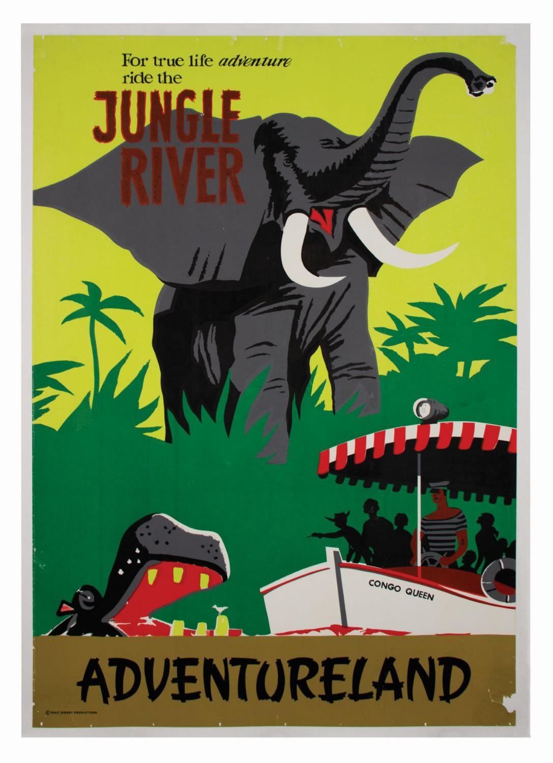 (Disneyland, c.1955) An original hand-silkscreened poster for the Jungle Cruise attraction in Disneyland's Fantasyland. Featuring an eye-catching exotic animal and riverboat design by Bjorn Aronson, the iconic poster teems with humorous details. Archivally linen-backed for preservation but otherwise unrestored, the piece measures 54"x36" and is in good condition with corner loss, edge tears and pin holes with paper loss, creasing and tears along the left edge, tears and spot paper loss in the Jungle River title, and occasional handling creases, scuffs, and surface abrasions throughout, the extent of which has been greatly improved through the linen-backing process.