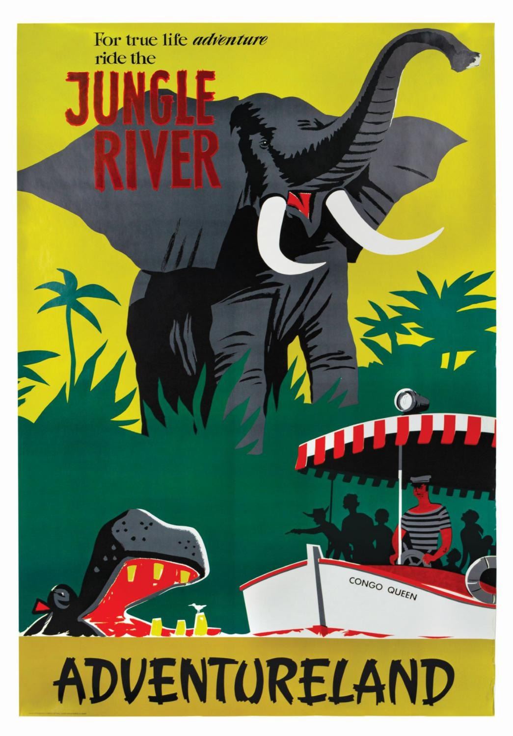 (Disneyland, c.1990s) A Jungle River attraction poster reproduction from the Disney Gallery featuring the original design by Imagineer Bjorn Aronson. For a very short time, the Disney Gallery offered a limited amount of full-size attraction poster reprints from some of the most beloved Disneyland attractions. This faithful recreation measures 54"x36" and is in very good condition with minor wear.