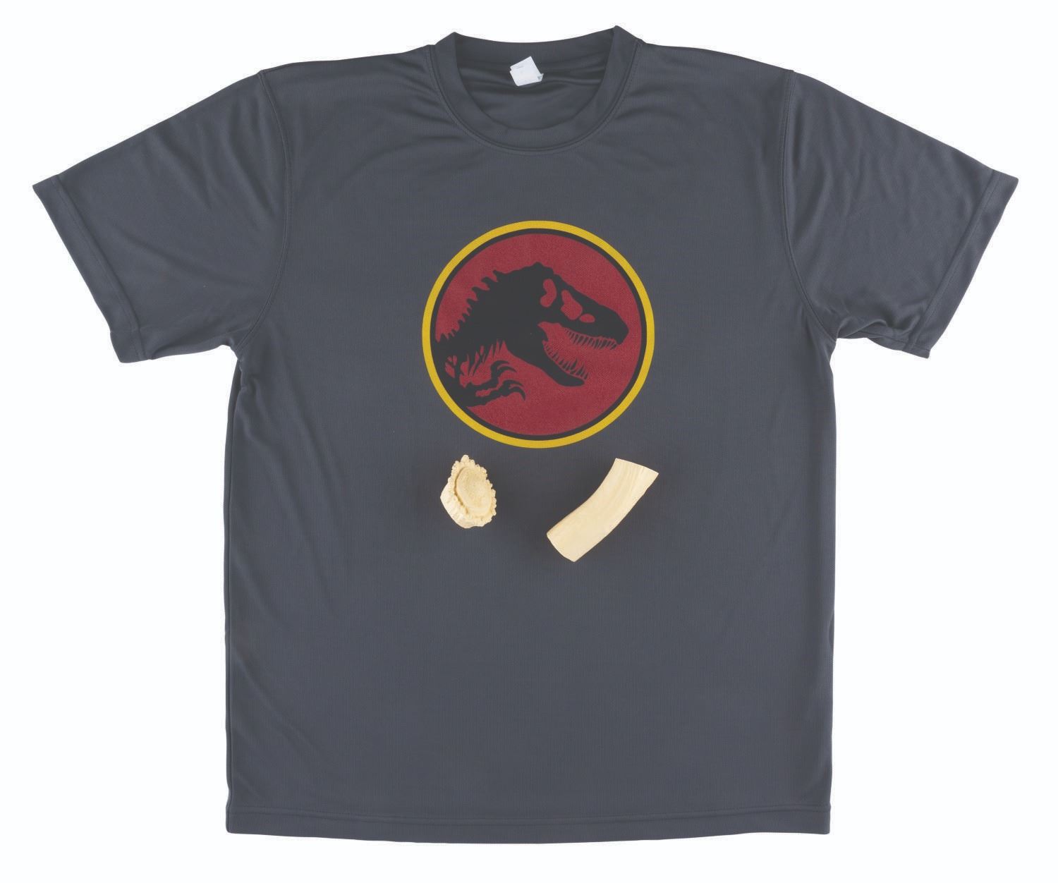 (Universal, 2001/2022) A pair of resin dinosaur bone castings from "Jurassic Park III” and a crew shirt from "Jurassic World: Dominion.” The bone castings were used during production for scale and reference purposes. The shirt displays the Jurassic Park logo on the front and features "Jurassic World Dominion" on the back, along with the shooting locations. The cast bones measure 2.25” in diameter and 1.5” tall and 1.5” in diameter and 4.25” long, while the mesh shirt is labeled a size L, all in fine condition.
