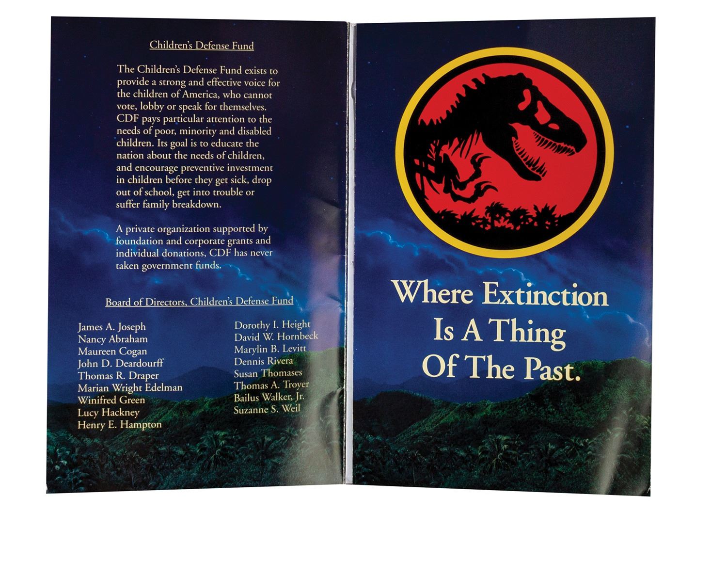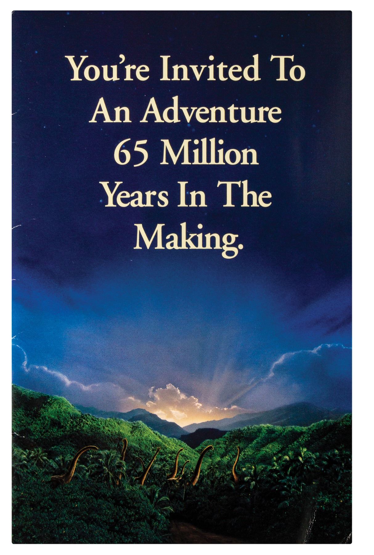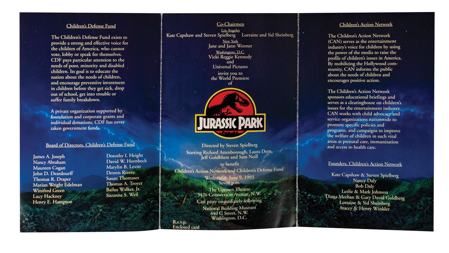 (Amblin, 1993) A very rare invitation to the premiere event for Jurassic Park on June 9th, 1993. The tri-fold invitation lists details about the premiere event benefiting the Children's Action Network and Children's Defense Fund. The inner vellum insert, RSVP card and envelope, and outer Jurassic Park mailing envelope are all still included. This particular invitation comes from the collection of Bill Wallen, who helped create promotional and advertising campaigns for the film. Measuring 9.25"x5.75", the invitation is in good condition overall with a few small creases along the edges and to the left-edge of the vellum sheet.