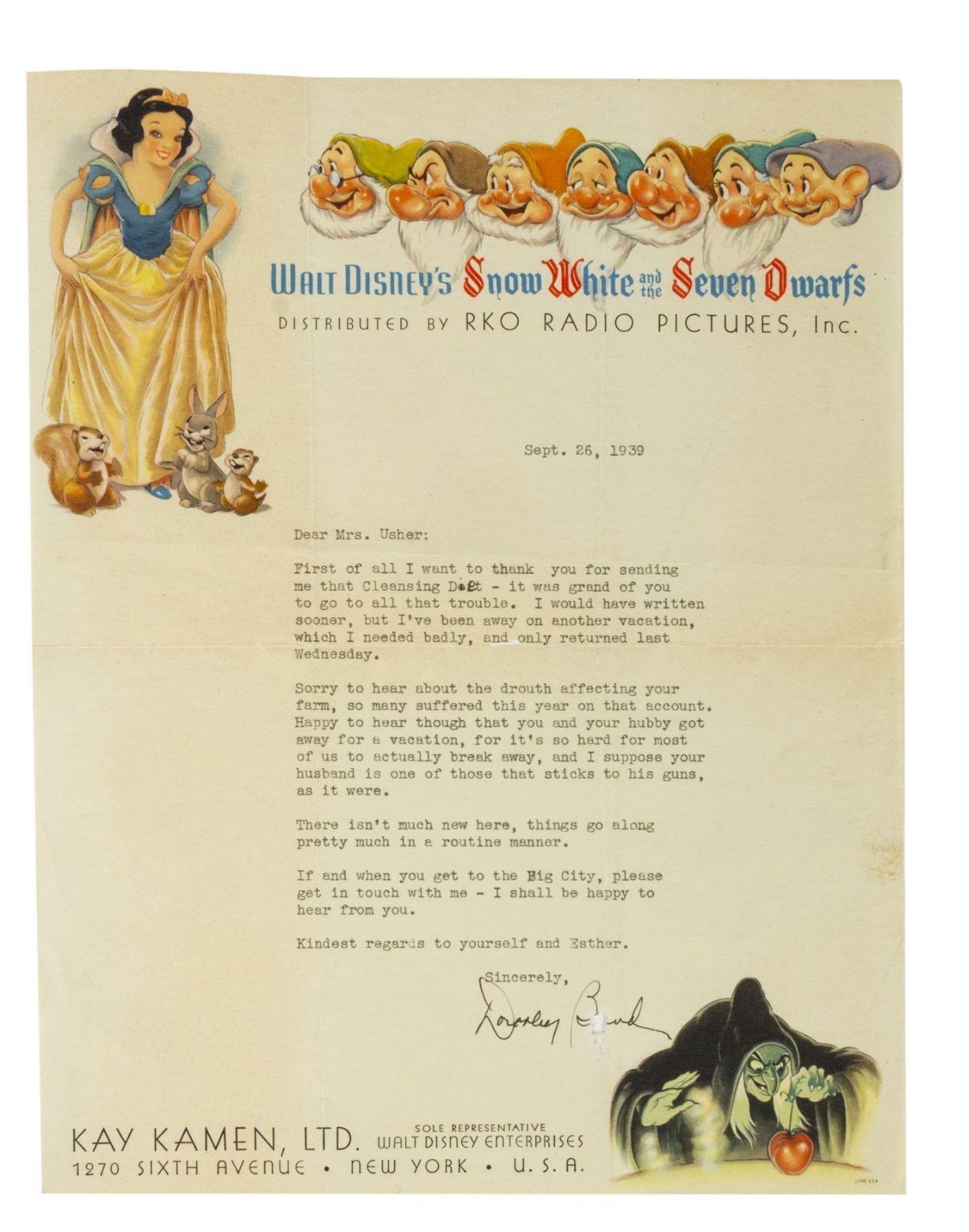 (Kay Kamen, 1939) A very rare letter typed on official Kay Kamen, Ltd. letterhead. Kay Kamen was the sole merchandising representative of Walt Disney Enterprises, and this letterhead proudly promotes Walt Disney's Snow White and the Seven Dwarfs. The letter, sent in September of 1939, is addressed to a Mrs. Usher, and the sender appears to be a "Dorothy Bond," who was likely an employee or secretary for Kamen. Measuring 11"x8.5", the letter is in fair to good condition with faint fold lines from its original use and yellowing to the back of the paper. There are a few small tears, such as in the "o" of Bond, and under the words "and only" in the center of the letter.