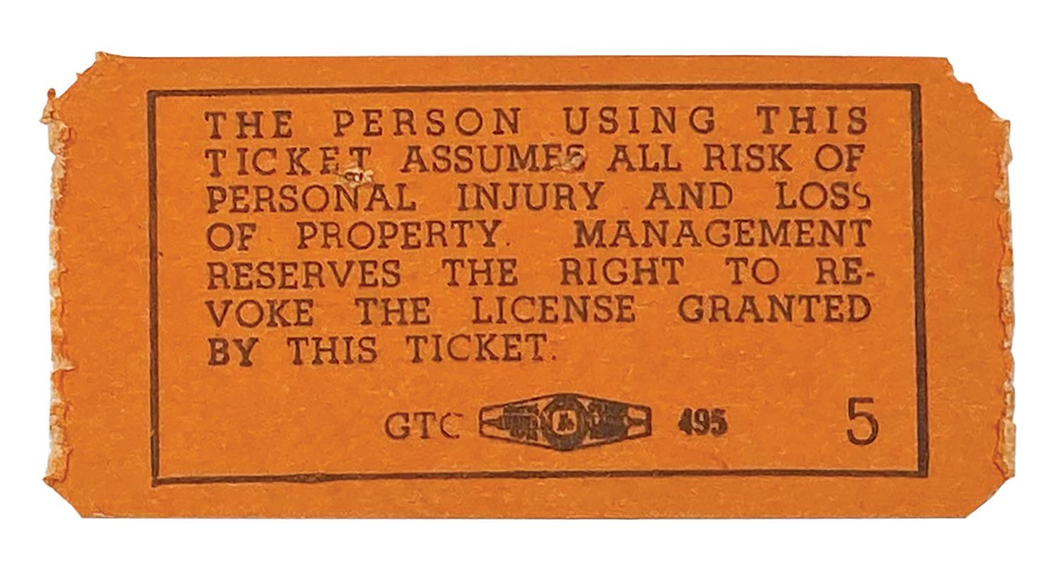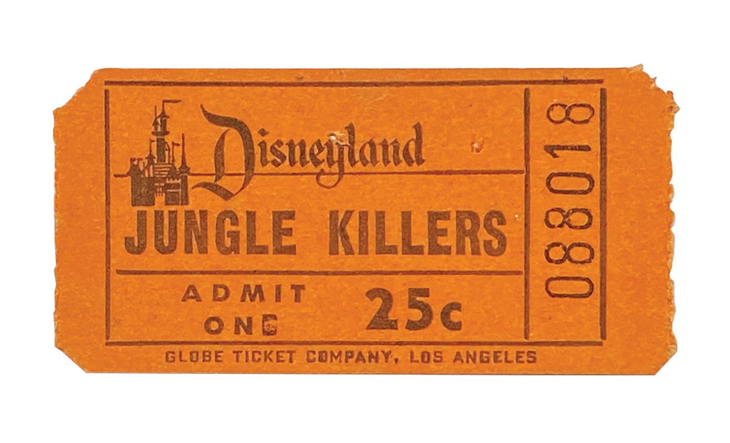 (Disneyland, 1956) An extremely rare admission ticket for the Keller's Jungle Killers attraction at Disneyland. The Jungle Killers attraction was originally part of the Mickey Mouse Club Circus, however, the short-lived Mickey Mouse Club circus closed after only 2 months, forcing Disney, still under contract with George Keller and his Jungle Killers animal show, to make it its own separate attraction between February and September of 1956. Due to the very short life of this unique attraction, very few original admission tickets have survived. This particular ticket is numbered 088018 and measures 1"x2". The condition is very good with minor wear.