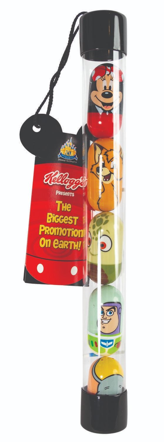 (Kellogg's, 2005) A set of (5) Disney Wobblers created by Kellogg's in celebration of the Disneyland 50th Anniversary: A Global Celebration festivities. Consisting of a plastic capsule with a weighted base and Disney character graphics, these un-knock-over-able Wobblers were a cross promotion with the official breakfast sponsor of Disneyland and Walt Disney World, Kellogg's. These sample set Wobblers are housed in a plastic tube with attached explanatory Disneyland 50th Anniversary card. Each Wobbler measures 3" tall and the tube is 16.25" tall x 1.75" in diameter. Both toys and packaging are in fine condition with minor wear. The card exhibits faint stress creasing and corner wear.