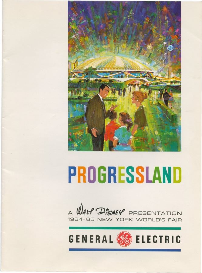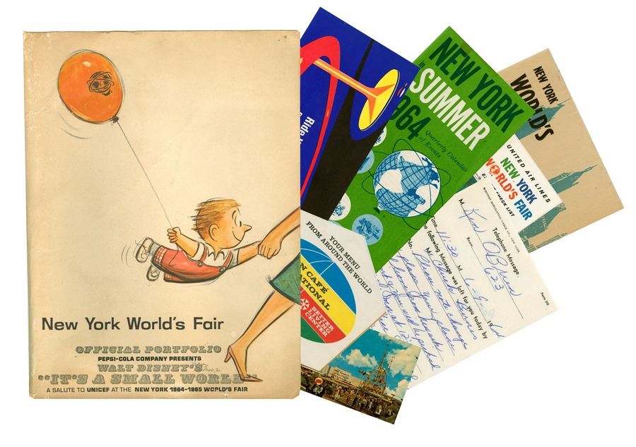 (World's Fair, 1964) An extremely rare "Official Portfolio" from the 1964-65 New York World's Fair. This portfolio belonged to Imagineer Ken O'Brien who worked extensively on the "Hall of Presidents" as well as other exhibits at the World's Fair. This portfolio was used during a planned tour of the Fair by Disney staff in June of 1964. The portfolio includes an amazing array of printed material as well as O'Brien's personal notes and observations for some of the attractions. Some of the items include souvenir maps, a "Progressland" program, several postcards of attractions, a studio printed list of hotel and apartment assignments for the visiting Imagineers, the planned itinerary for their visit, O'Brien's notes on the Ford Exhibit, and several more pieces of World's Fair memorabilia. This is an amazing archive from a historic moment in Disneyland history. This set is in good condition with some expected wear throughout from use.