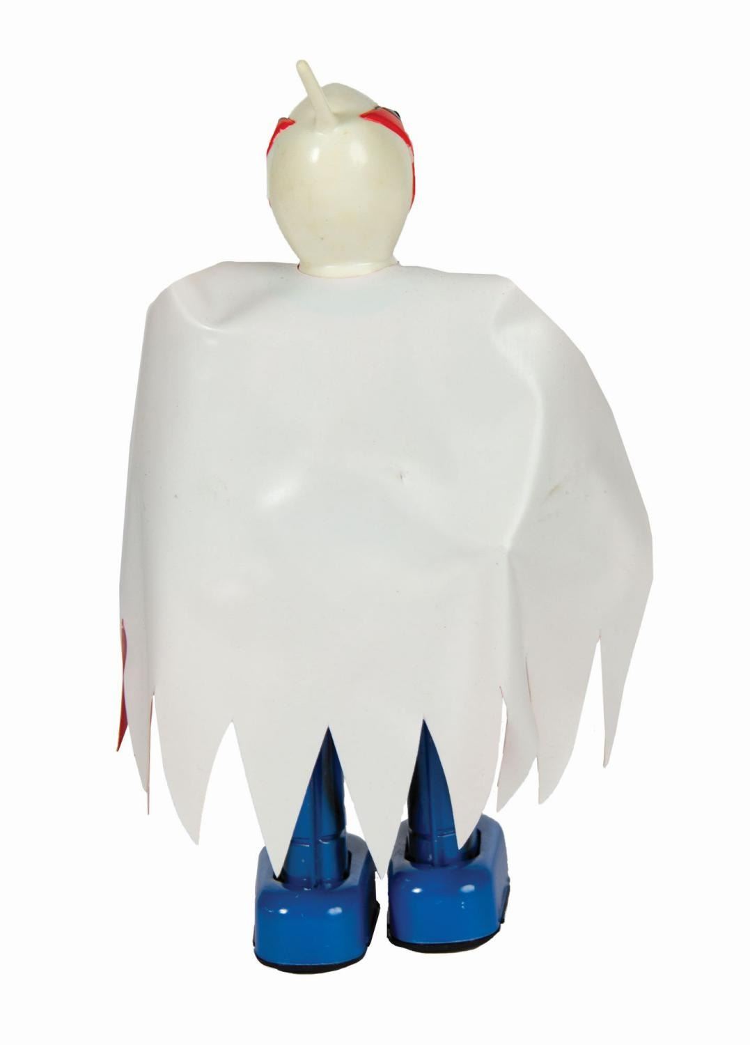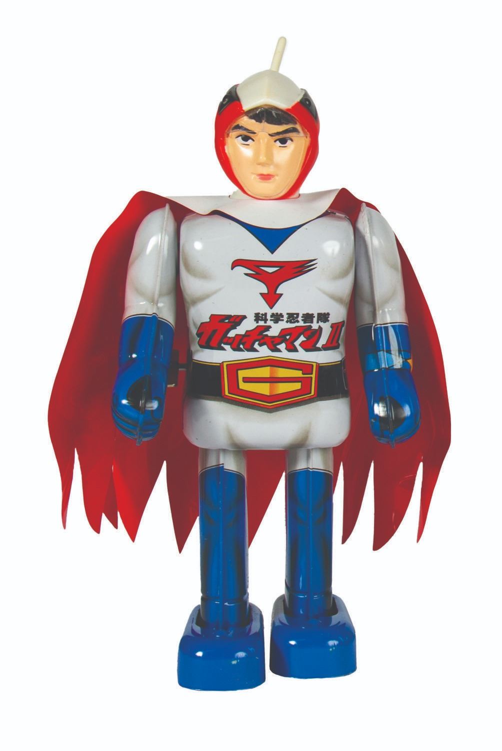 (Ansonii, c.1970s) A tin-litho mechanical wind-up toy Ken Washio, the Eagle (also known as Gatchaman) figure manufactured by Japanese toymaker Ansonii based on the anime series Science Ninja Team Gatchaman. Consisting of a tin-litho body and limbs with a vinyl head and cape, the figure walks forward and lifts its arms up and down when the integral key is wound. The original, highly illustrated cardboard box packaging is included. The figure measures 9.25" tall and is in very good condition with bending to the antenna, spot cape puncture, and surface wear. The box measures  9.5"x4.5" and 2.75" deep and exhibits some edge wear, surface loss at the upper right face, and light creasing.
