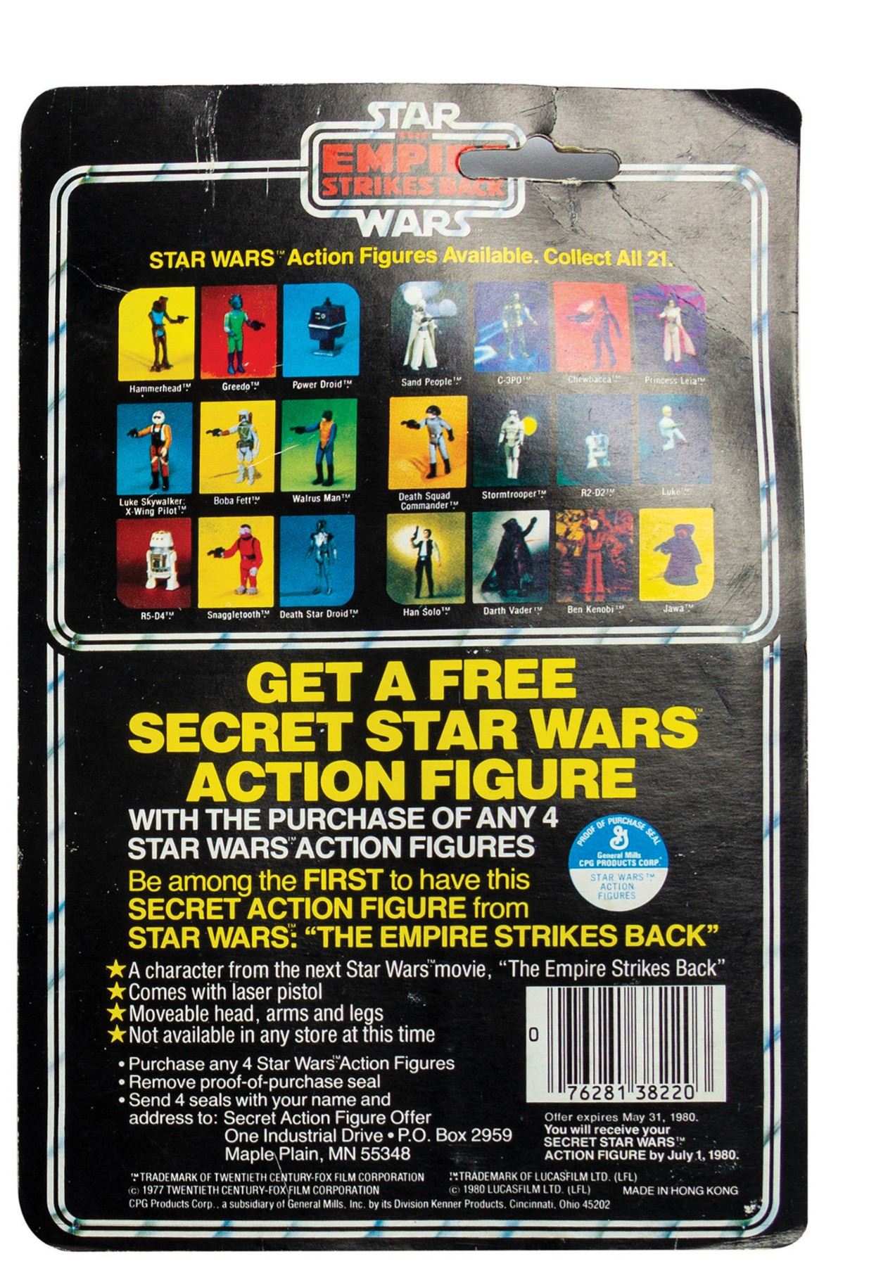 (Kenner, 1980) A very rare unopened C-3PO figure by Kenner. Created as part of the 21-figure The Empire Strikes Back set, this figure has never been opened. The packaging measures 9"x6" and is in good condition with several creases to the card backing.