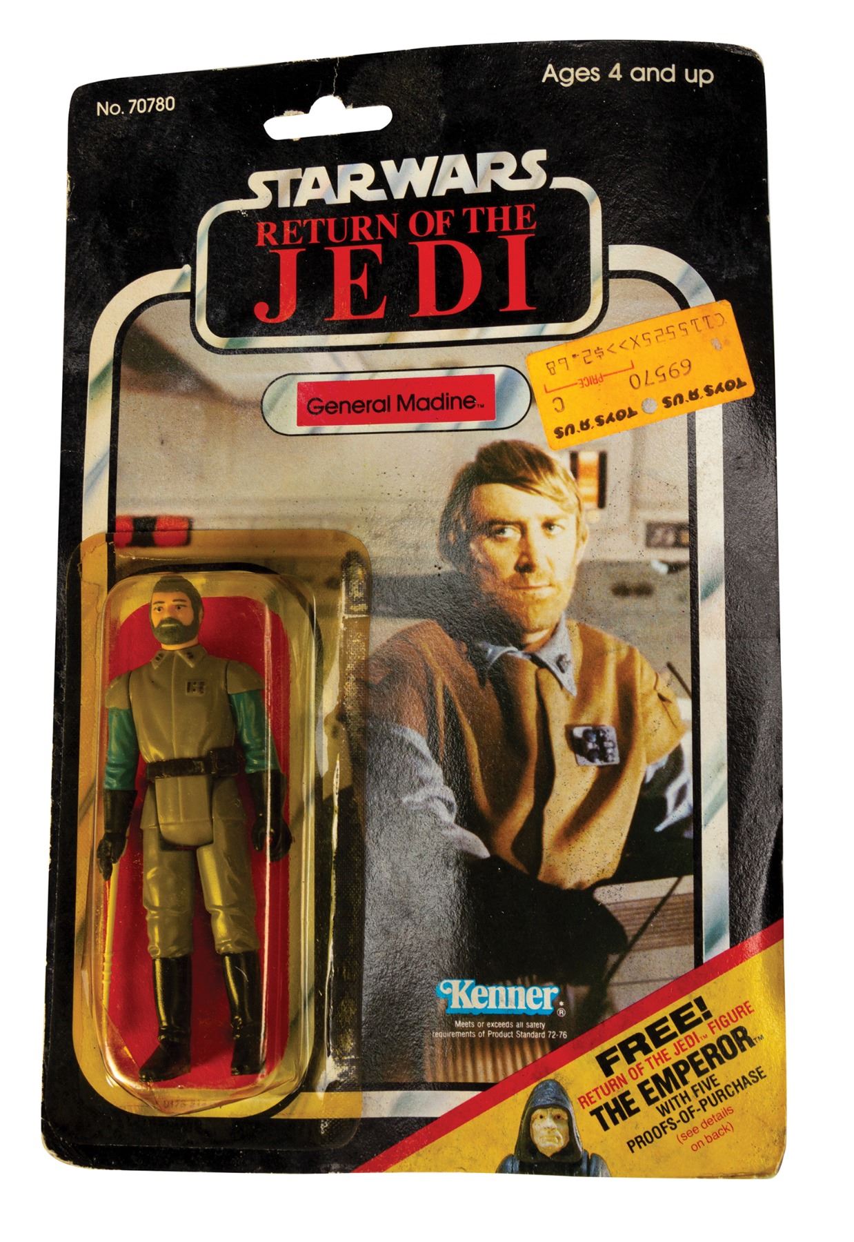 (Kenner, 1983) A very rare unopened General Madine figure by Kenner. Created as part of the 65-figure Return of the Jedi set, this figure has never been opened. The packaging measures 9"x6" and is in fair to good condition. There is some warping to the card backing from moisture exposure, as well as some worn areas on both sides of the card. The plastic capsule has a yellow tint from age.
