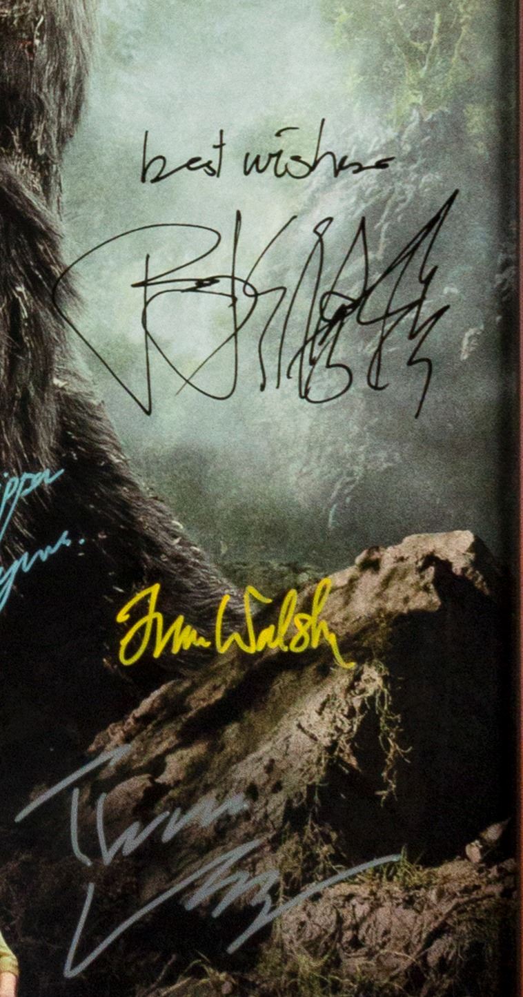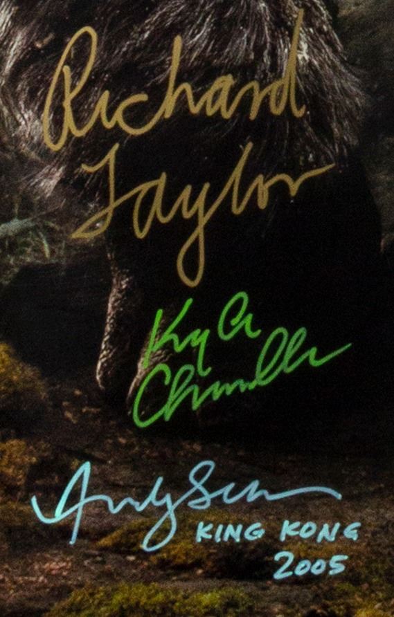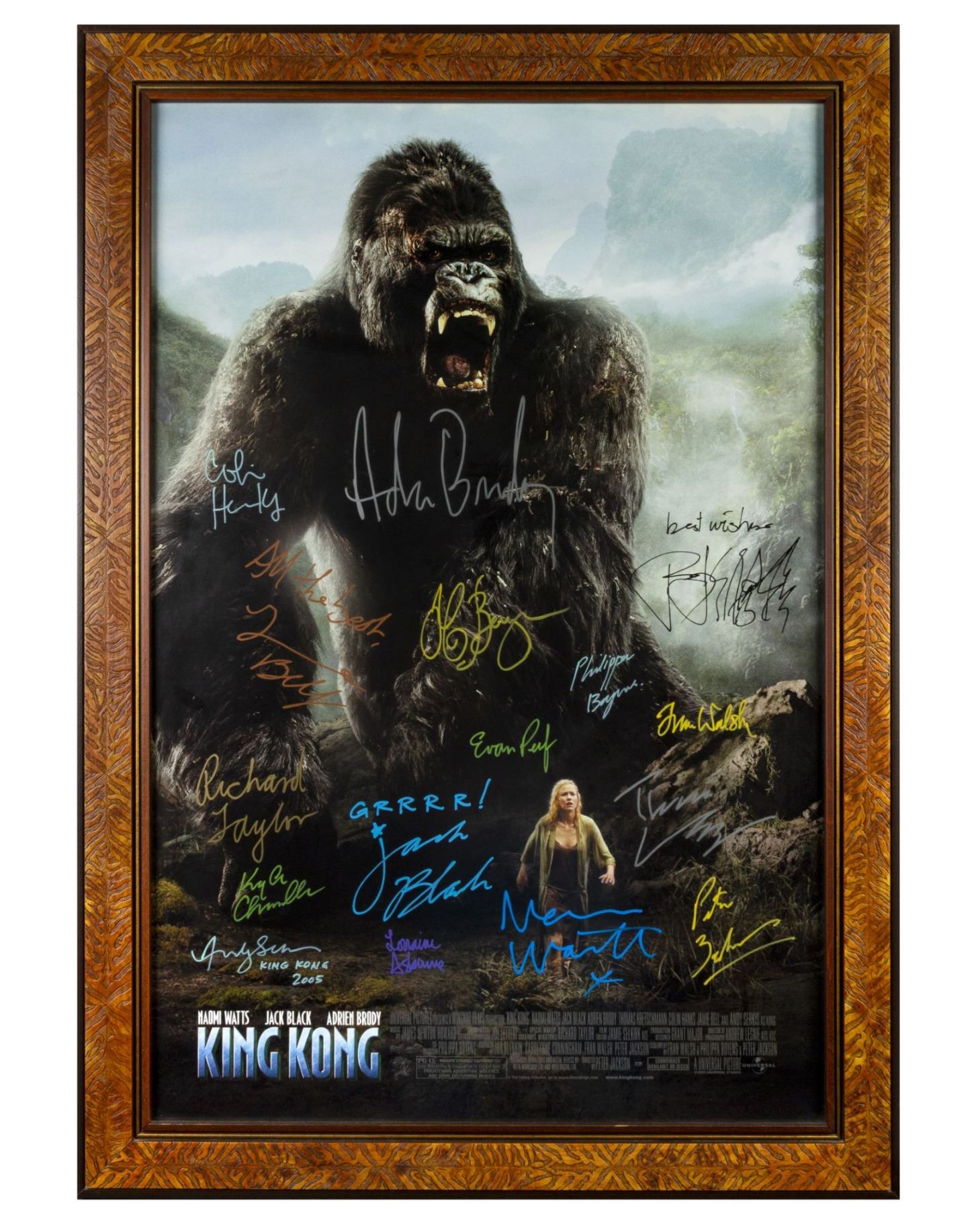 (Universal, 2005) An incredible multi-signed one sheet poster for Universal Pictures' feature film "King Kong". This poster features a large image of Kong, and includes the signatures of Naomi Watts, Jack Black, Adrien Brody, Andy Serkis, Thomas Kretschmann, Colin Hanks, Jamie Bell, Evan Parke, Kyle Chandler, Peter Jackson, Fran Walsh, Philippa Boyens, and more for a total of 16 original autographs. Measuring 45.5"x32.5" within its stylish frame, the poster appears to be in very good condition, unexamined out of frame, with minor frame wear from previous display.