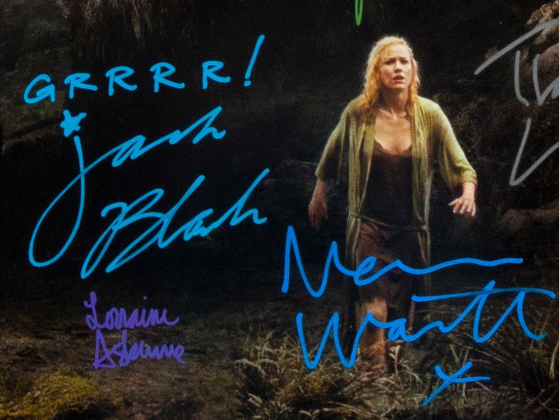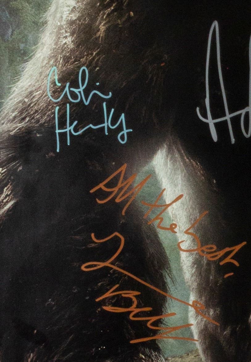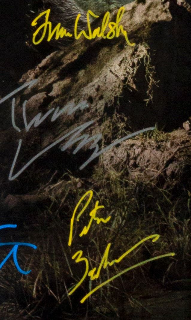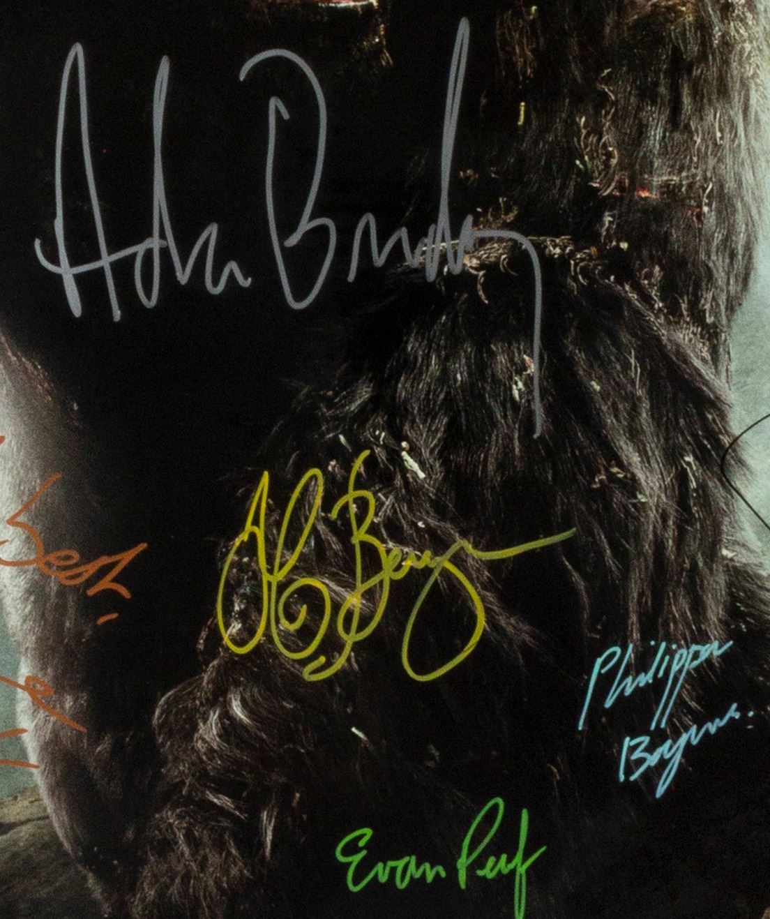 (Universal, 2005) An incredible multi-signed one sheet poster for Universal Pictures' feature film "King Kong". This poster features a large image of Kong, and includes the signatures of Naomi Watts, Jack Black, Adrien Brody, Andy Serkis, Thomas Kretschmann, Colin Hanks, Jamie Bell, Evan Parke, Kyle Chandler, Peter Jackson, Fran Walsh, Philippa Boyens, and more for a total of 16 original autographs. Measuring 45.5"x32.5" within its stylish frame, the poster appears to be in very good condition, unexamined out of frame, with minor frame wear from previous display.