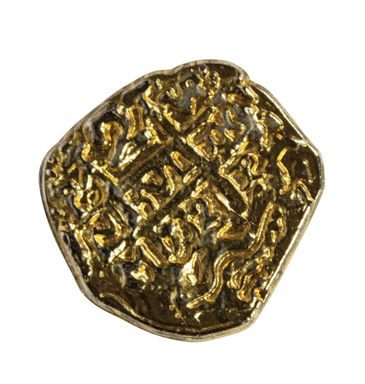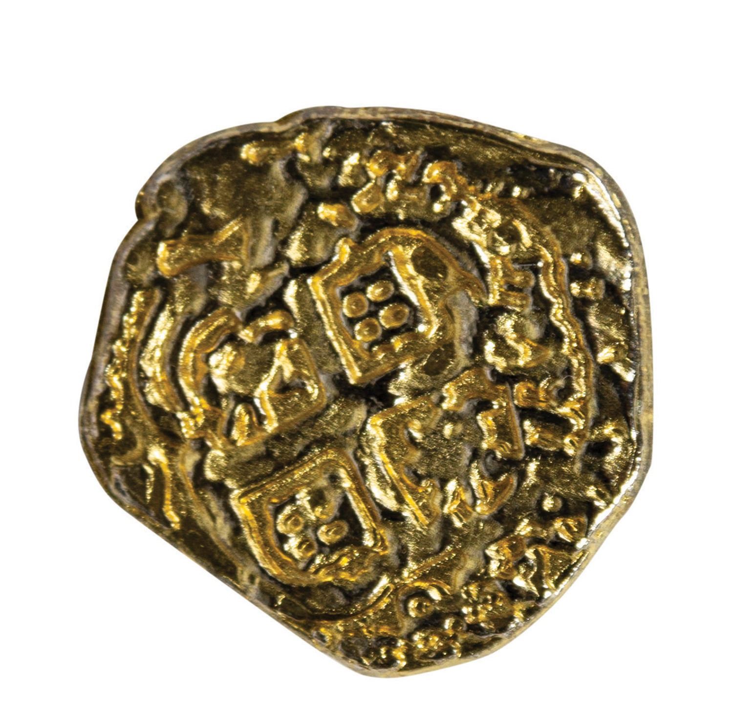 (Lucasfilm, 2014) An original prop gold piece from the latest addition to the popular Indiana Jones film series, Indian Jones and the Kingdom of the Crystal Skull. This style of small gold coin was used in both the Orellana Crypt scene and also the Akator treasure room. Measuring 1" in diameter, the coin is in very good condition with minor wear from use.