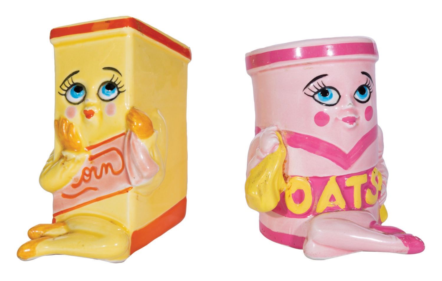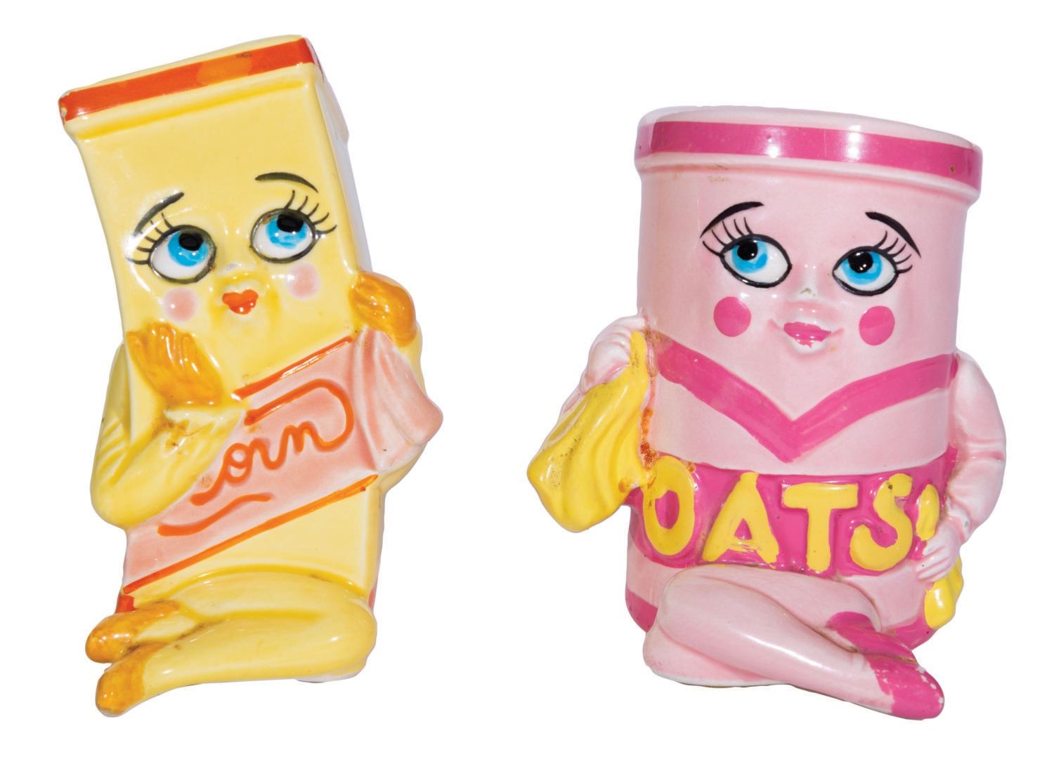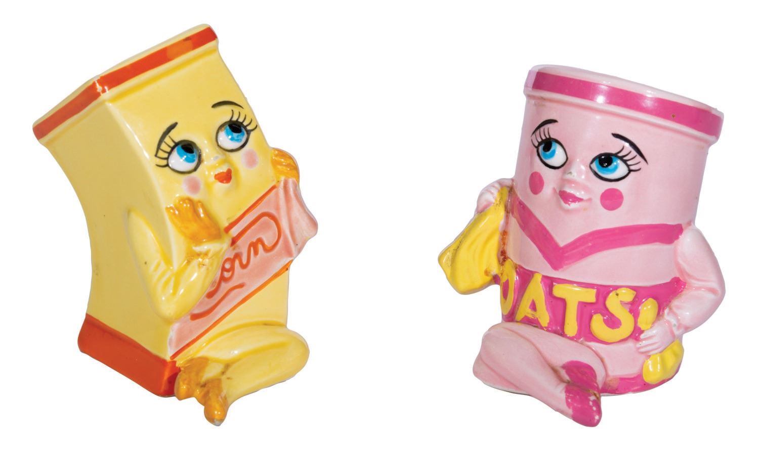 (EPCOT, 1981) A very rare pair of salt and pepper shakers based on the Cereal Sisters, Mairzy Oats and Connie Corn, from Epcot's Kitchen Kabaret. These hand-painted ceramic shakers measure 2.5" and 2.75" tall and are in good condition overall with paint wear from use, and two small chips on Mairzy Oats nose and left hand. Mairzy Oats has her original stopper while Connier Corn is missing hers.