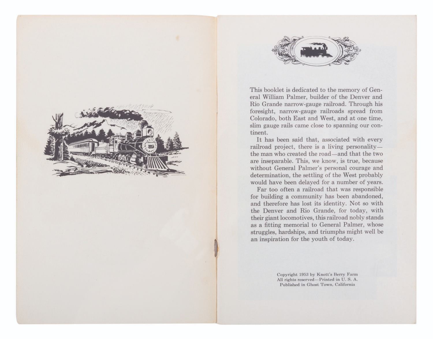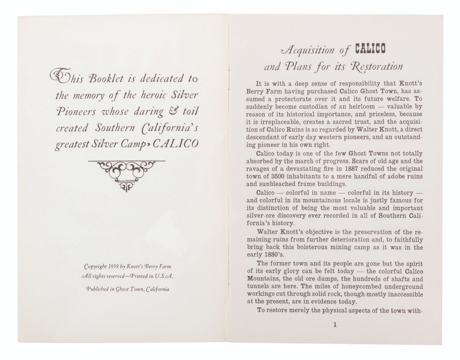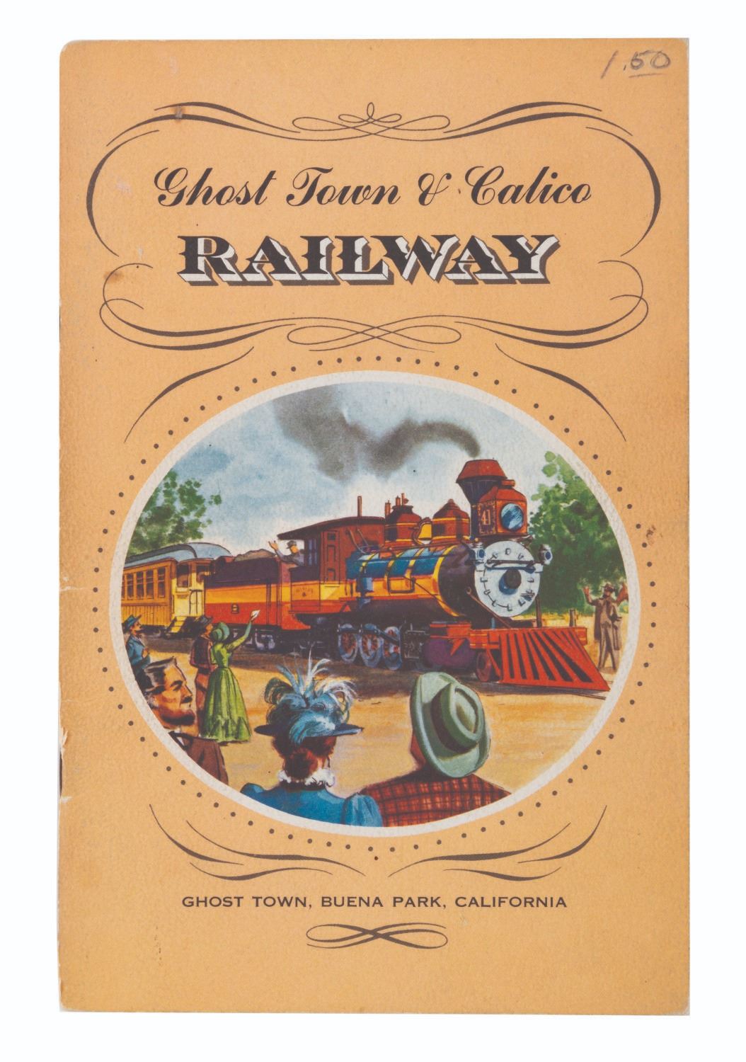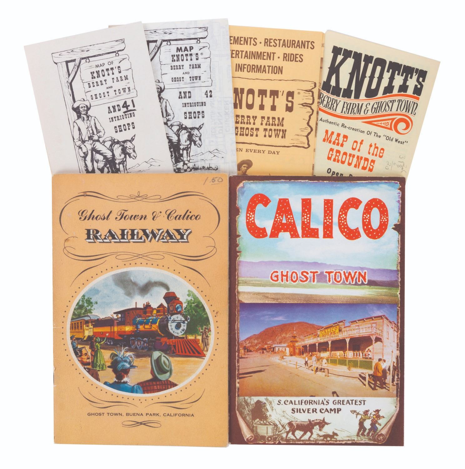 (Knott's Berry Farm, 1953-1970) A collection of maps and souvenir books from Knott's Berry Farm. Included are a 1953 book on the Ghost Town & Calico Railway, a 1959 book on the Calico Ghost Town, (2) souvenir maps from the 1960s showing different stages of the Park's development, and a 1970 map with a summer schedule for the Wagon Camp and Fiesta Village. Measuring from 3.75"x8.5" to 5.5"x8.5", the books and maps are in very good condition, with light wear from handling, some slight pencil marks, and (1) map having some tape residue from display.