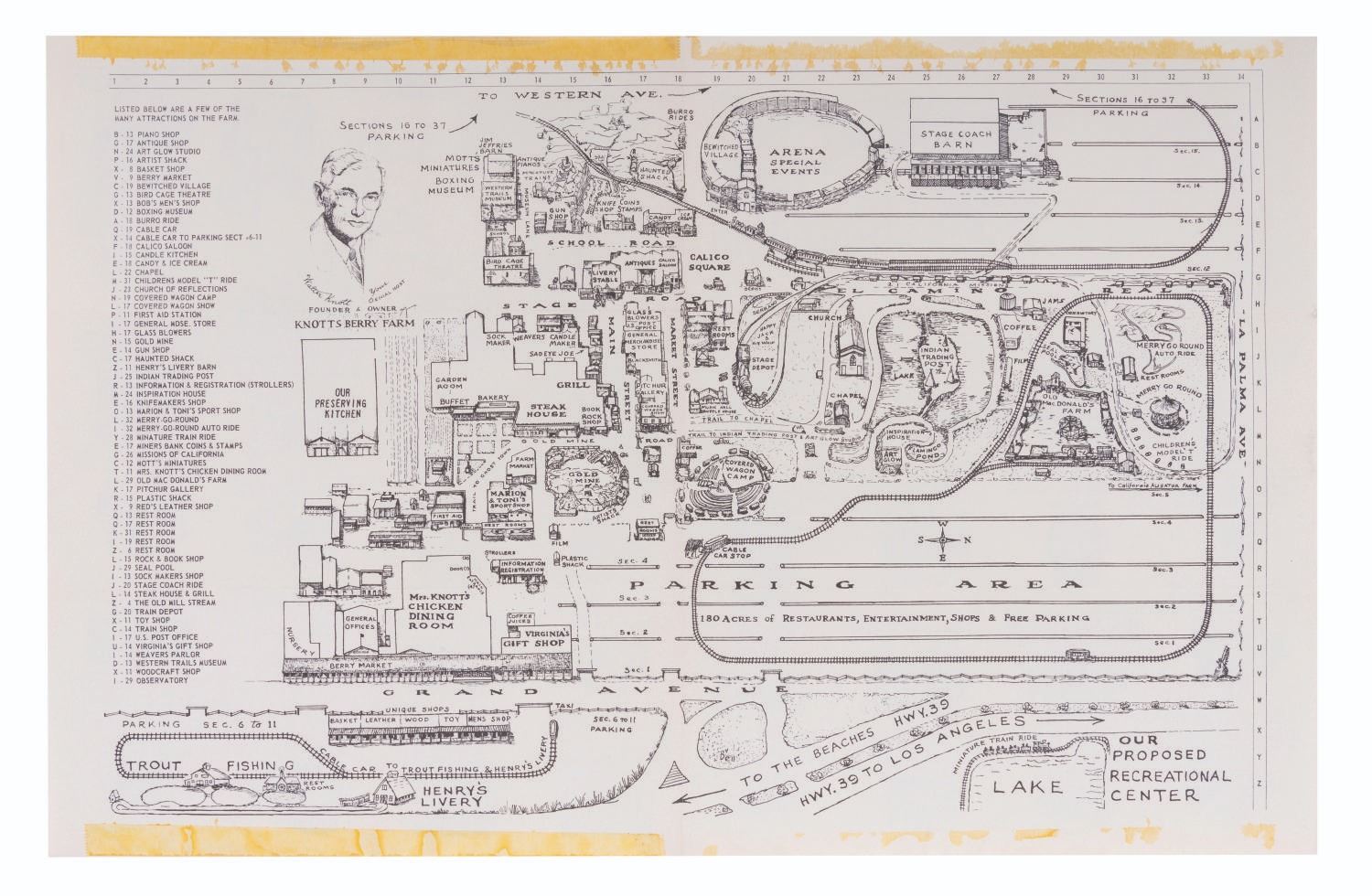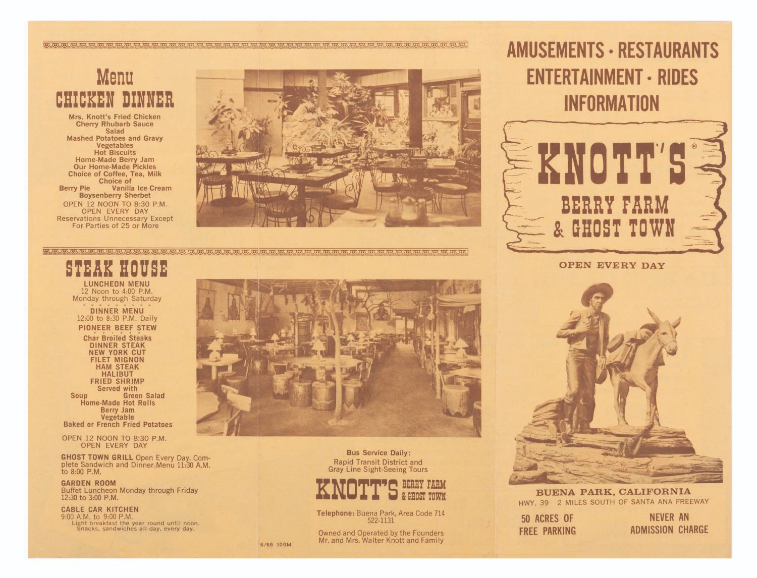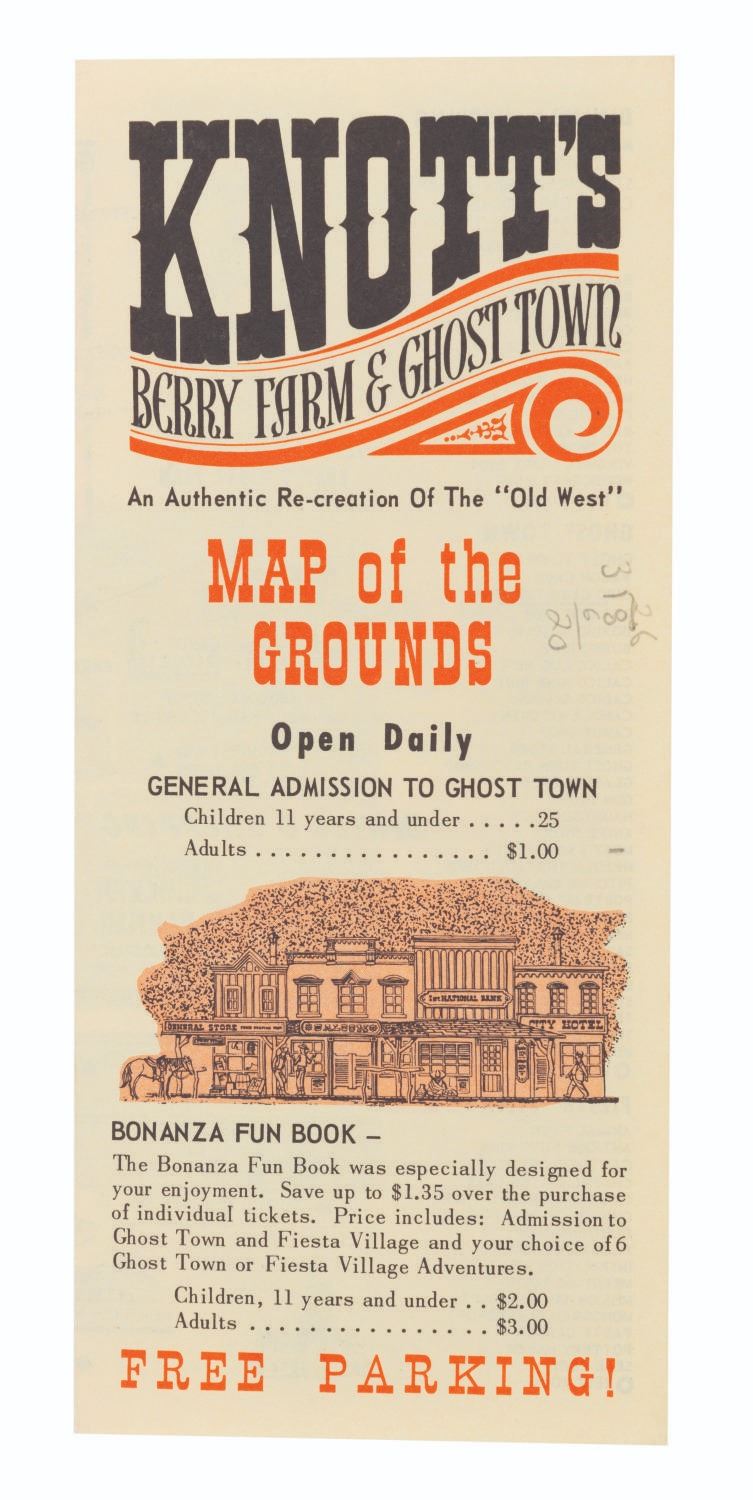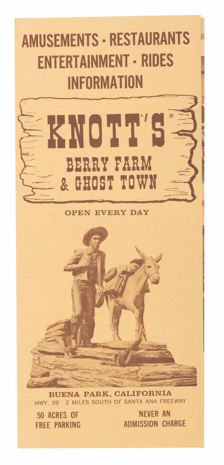 (Knott's Berry Farm, 1953-1970) A collection of maps and souvenir books from Knott's Berry Farm. Included are a 1953 book on the Ghost Town & Calico Railway, a 1959 book on the Calico Ghost Town, (2) souvenir maps from the 1960s showing different stages of the Park's development, and a 1970 map with a summer schedule for the Wagon Camp and Fiesta Village. Measuring from 3.75"x8.5" to 5.5"x8.5", the books and maps are in very good condition, with light wear from handling, some slight pencil marks, and (1) map having some tape residue from display.