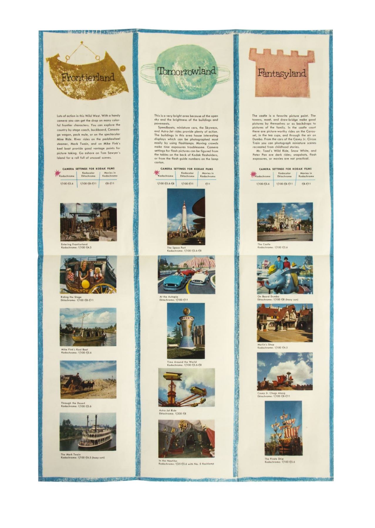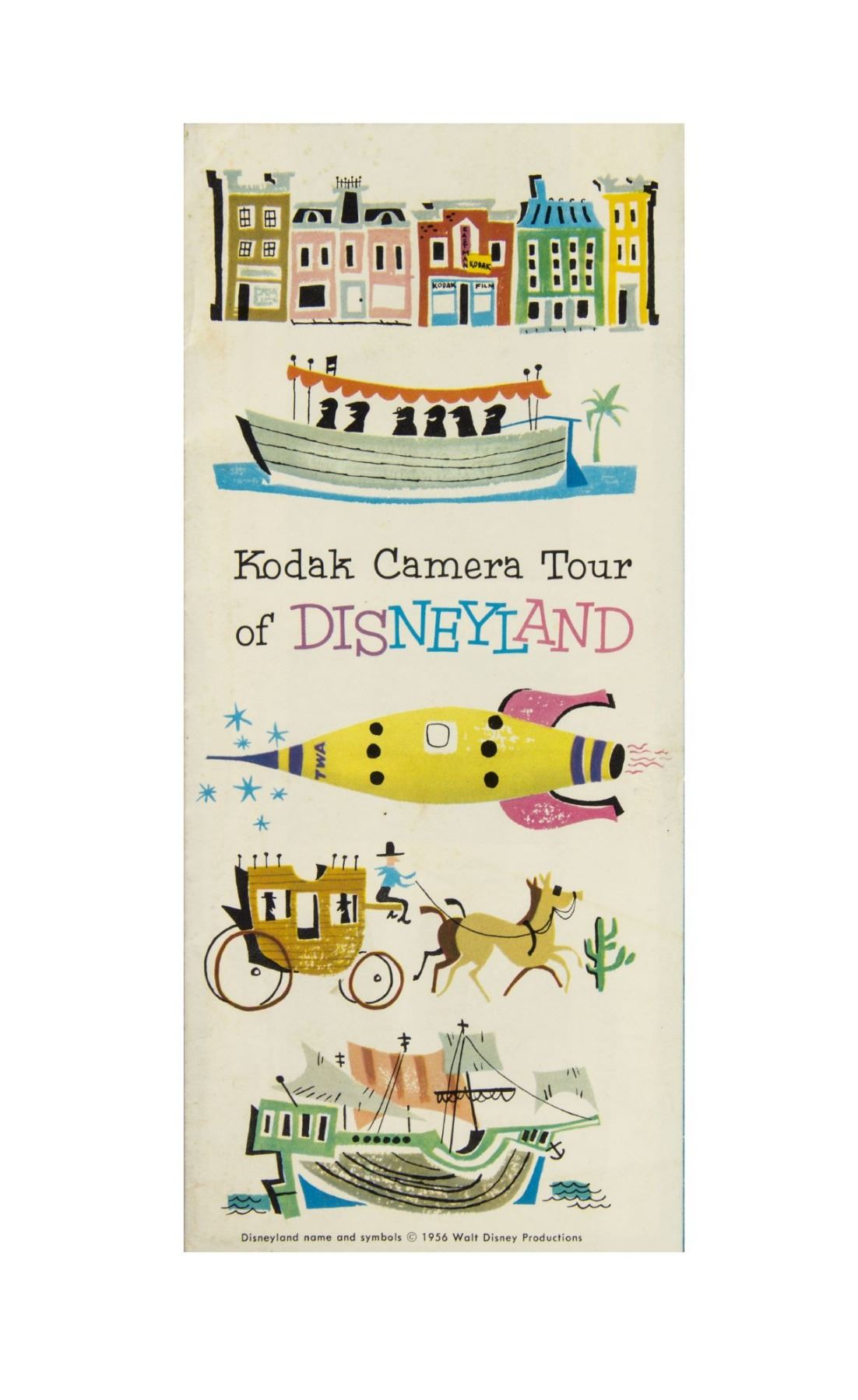 (Disneyland, 1956) A very rare pamphlet created by Kodak featuring beautiful photos from the different lands of the park. This pamphlet gives suggested camera settings for the best photos at various locations in the park. This item measures 8.25"x3.75" folded, and is in very good condition with minor wear.