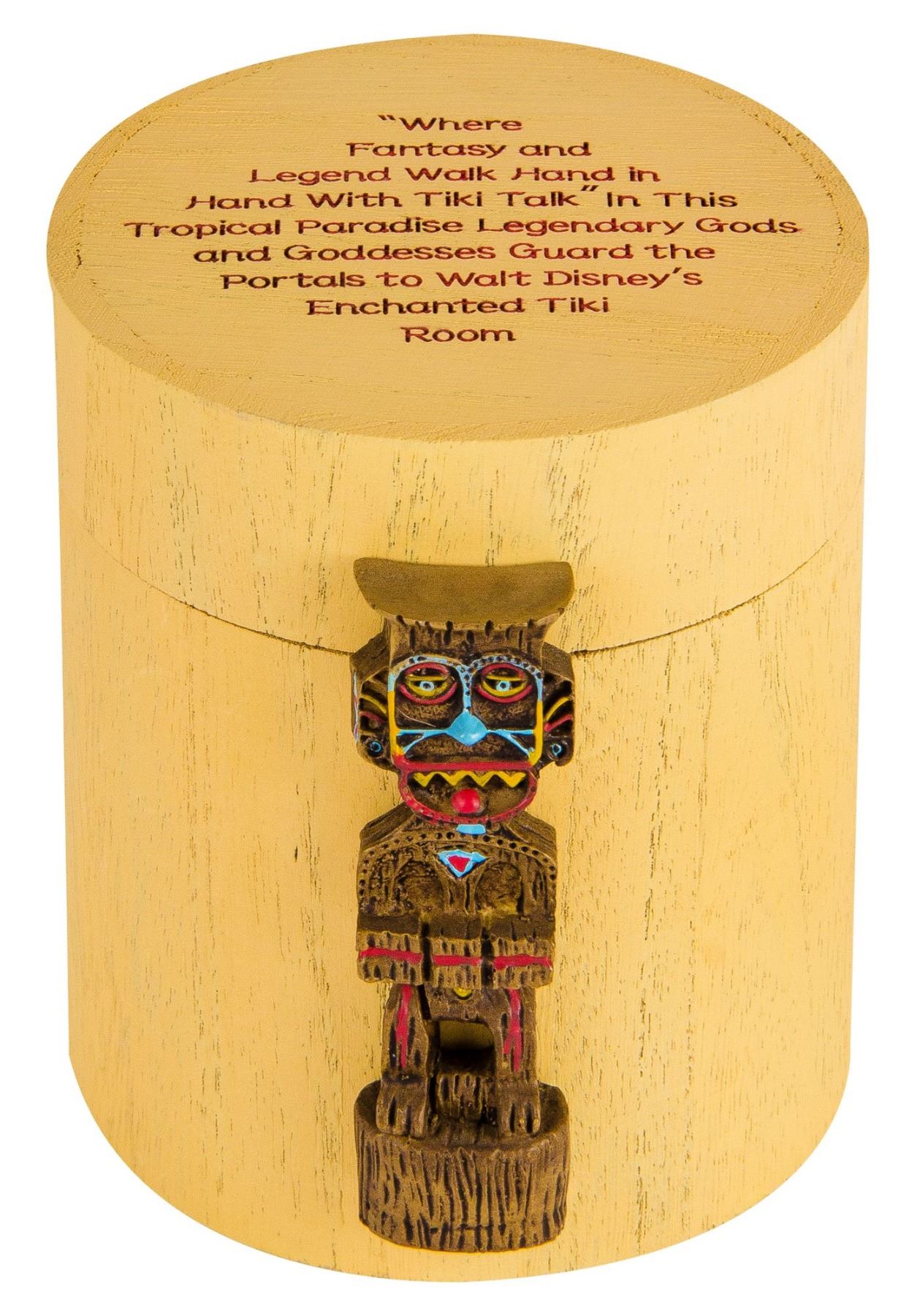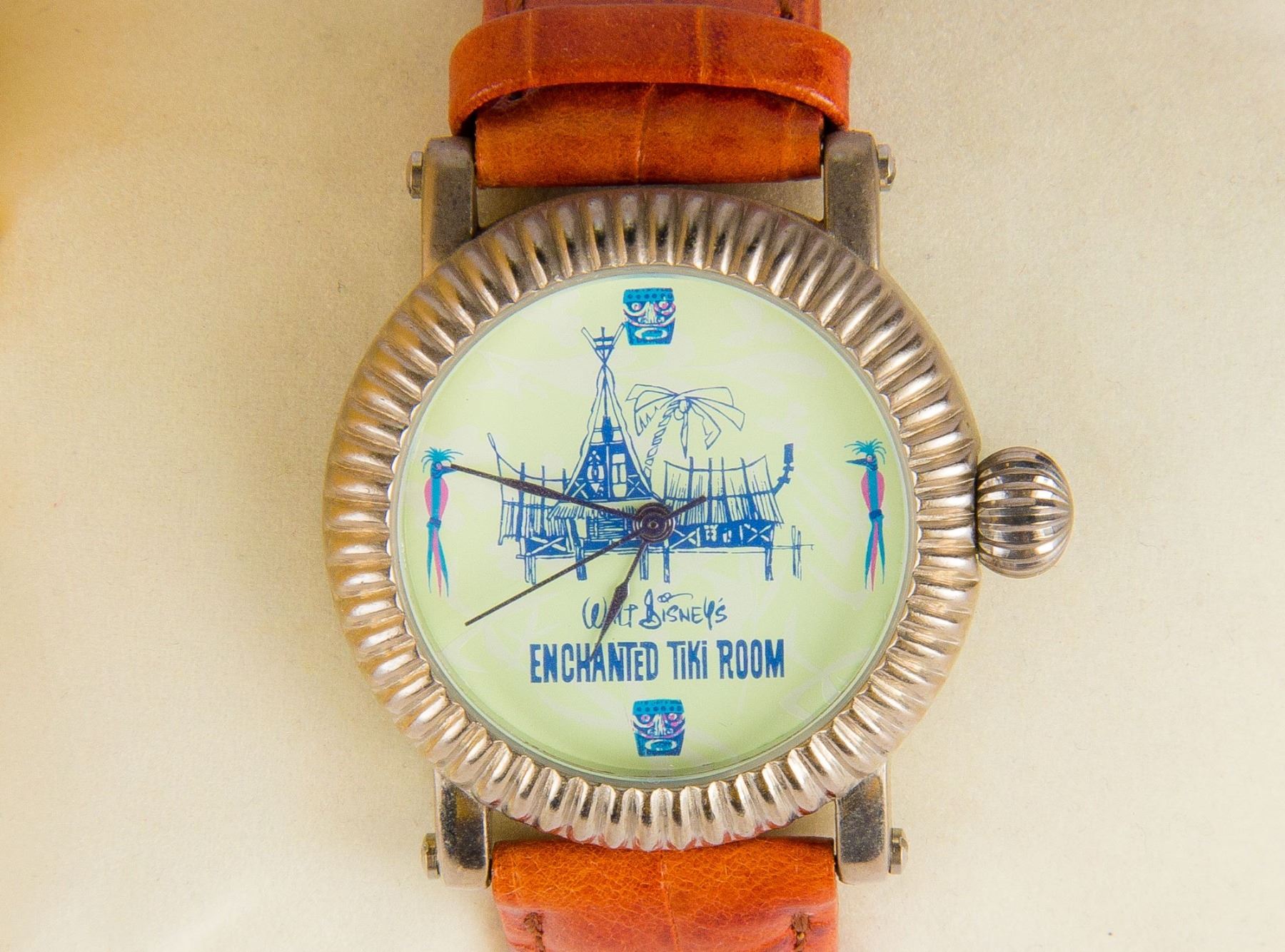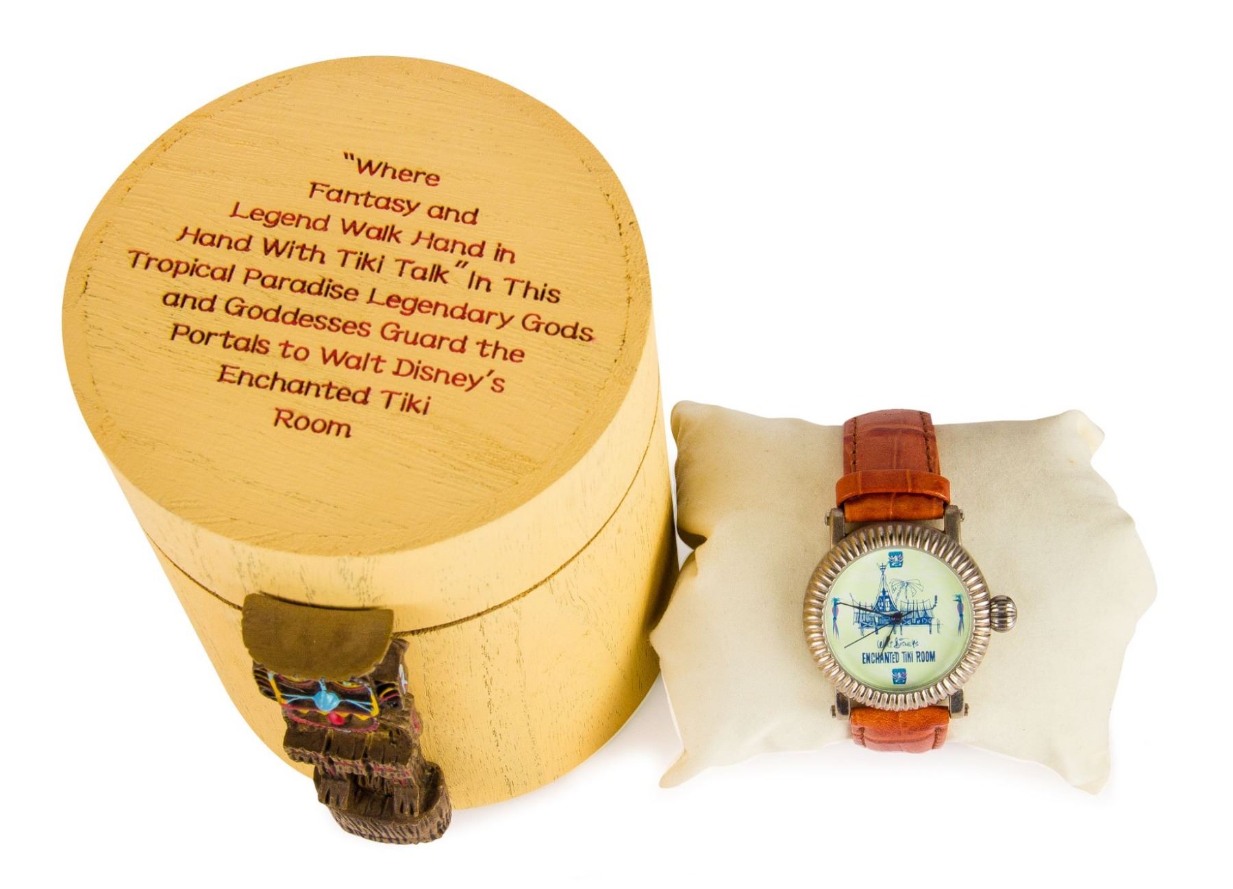 (Disneyland, 2000s) A limited edition watch themed for the "Enchanted Tiki Room". The watch-face, inspired by Rolly Crump's original designs, has imagery of the attraction building, and the watch comes in a decorative container with a small "Koro" tiki garden god adhered to the side. The watch has a stainless steel back that is etched 293/500, and has a leather strap. The box measures 4" in diameter and 4.75" tall and the watch is in very good condition.