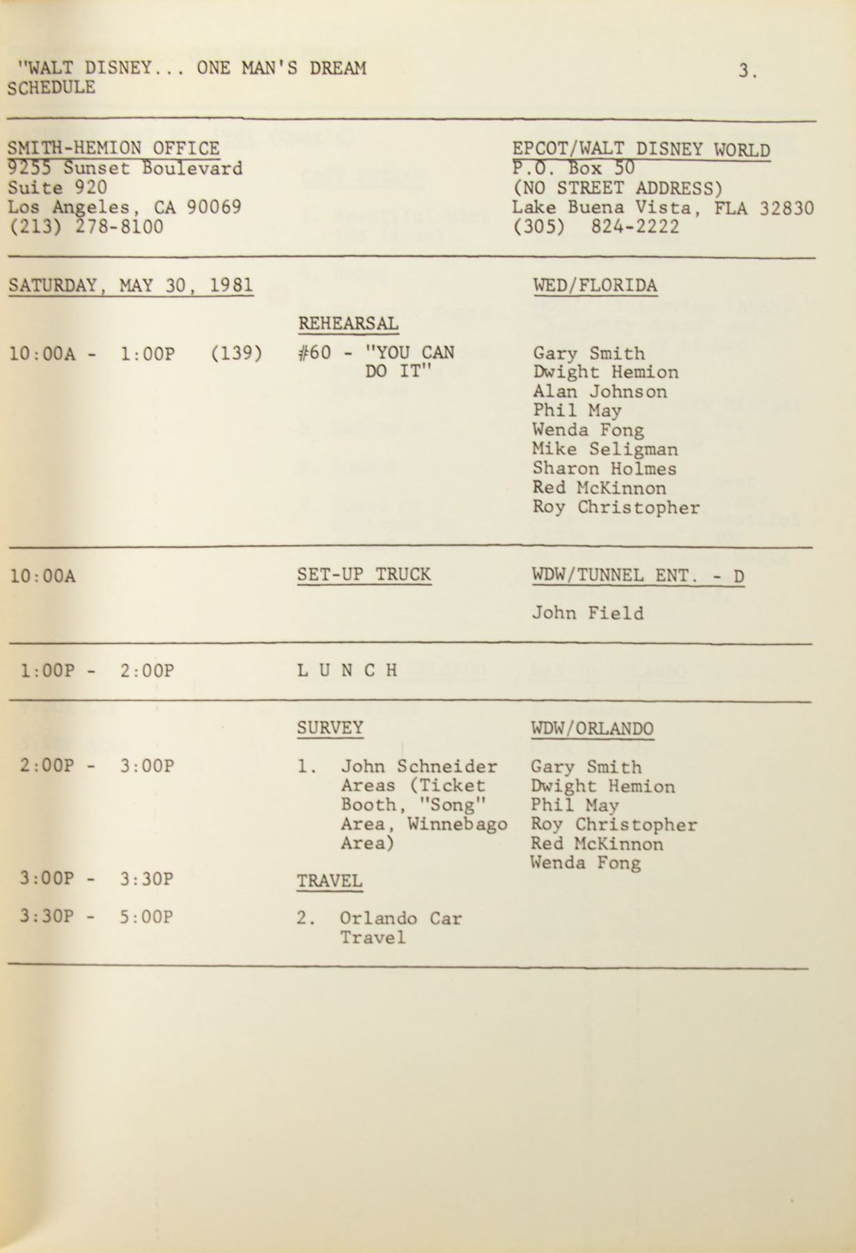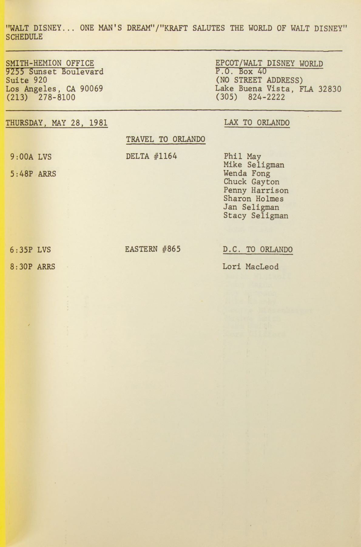 (Walt Disney World, 1981) A third draft of the 10th anniversary television special "Kraft Salutes the World of Walt Disney World." The draft includes a filming schedule, contact information for cast and crew, a short rundown, and the full script for the television event. Measuring 11"x8.5", the 151-page script is in good condition with some wear from age and use. There is a rectangle of residue on the upper left from where a label once was, and some color fading along the bottom edge and lower right side.