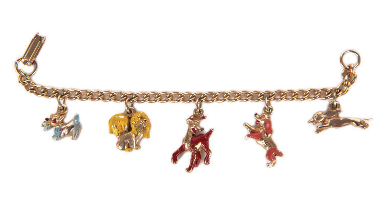 (Disney, 1955) A Lady and the Tramp 5-charm bracelet featuring charms of Jock, Peg, Tramp, Lady, and Dachsie from the Walt Disney Production. Measuring over 5" long, the chain link bracelet is in good condition with minor enamel loss to the charms.