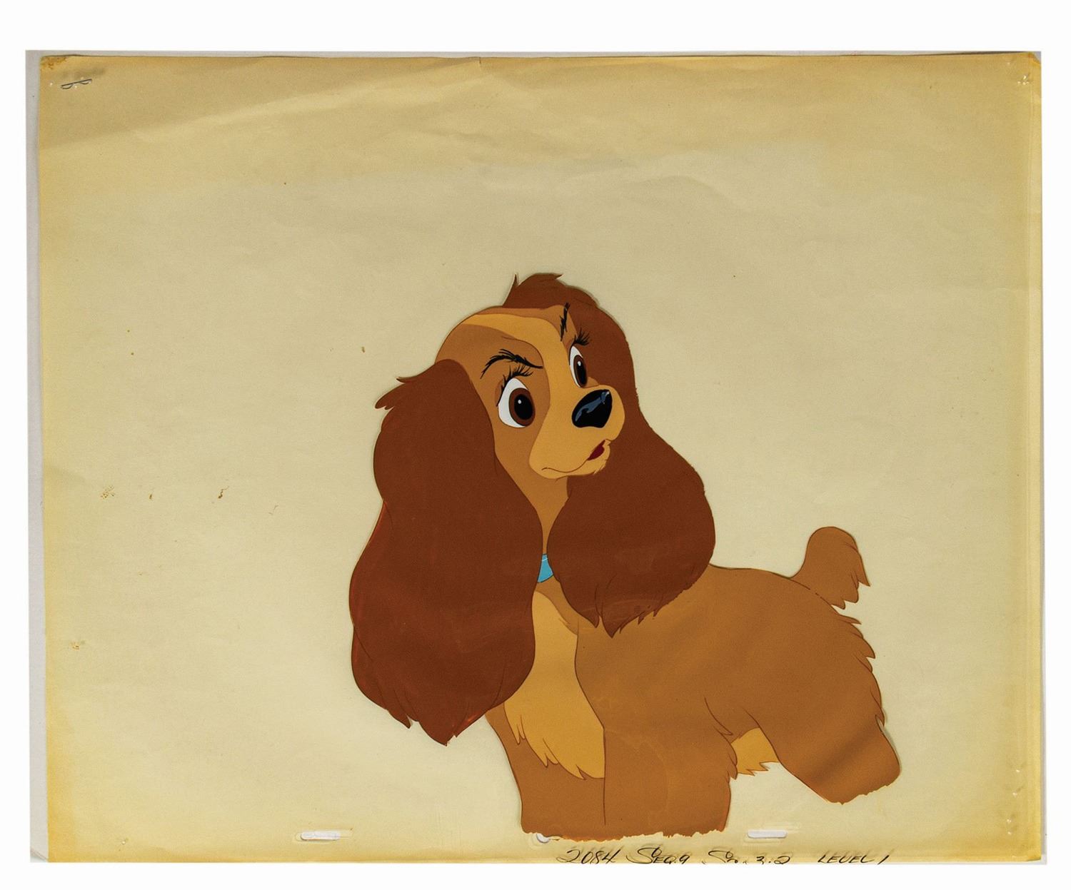 (Disney, 1955) An original model cel of Lady used during the production of the feature film Lady and the Tramp. Cels such as this one were often used as a reference for animators to test backgrounds and colors. There is a scene notation written beneath the image. The hand-painted cel has an image size of 8.75"x8.5" on the 12.5"x16" cel sheet and is in good condition with minimal paint wear. The image is adhered to the attached cel sheet behind it.