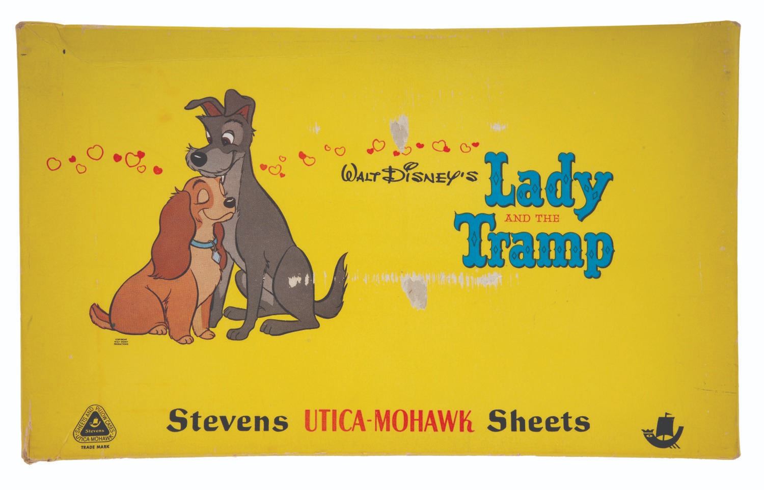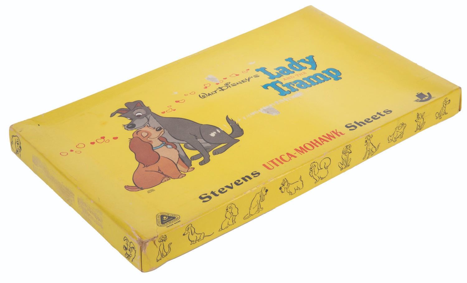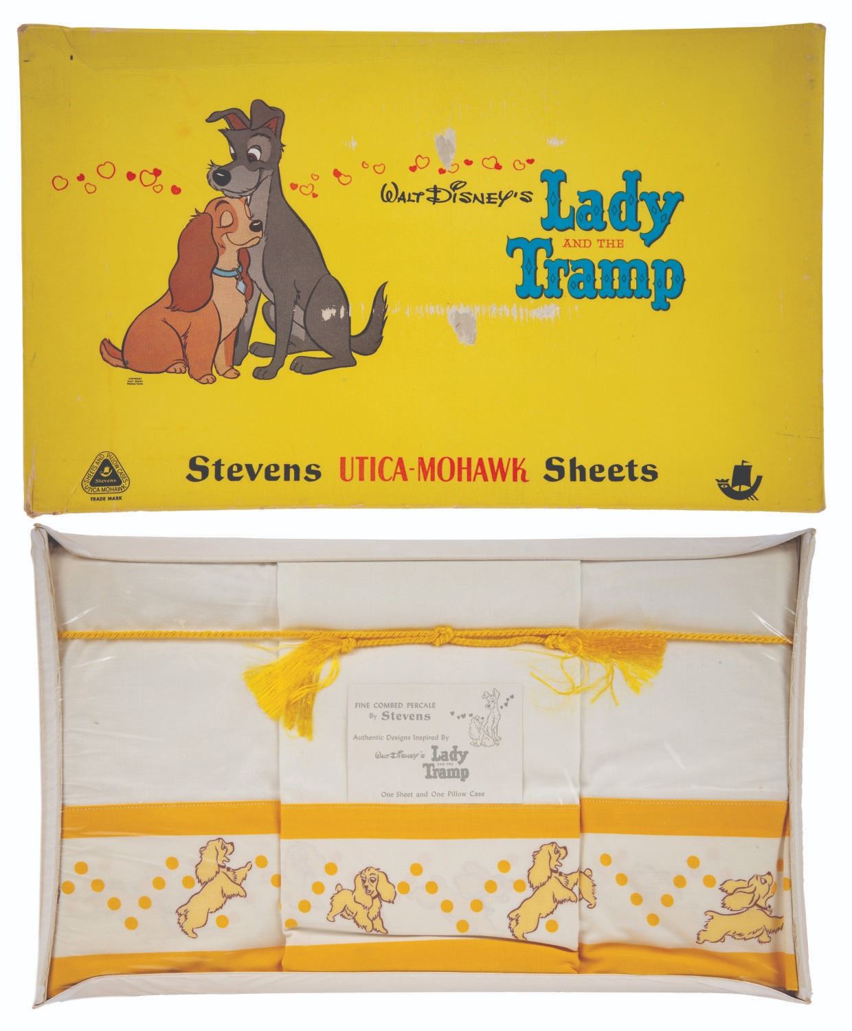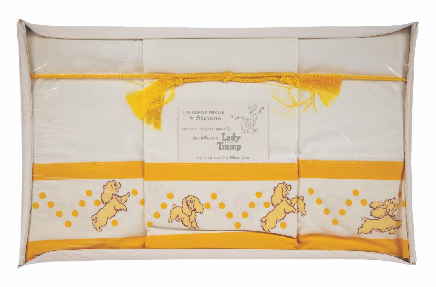 (Stevens Utica-Mowhawk, 1950s) A rare pillowcase and sheet set featuring designs inspired by Walt Disney's "Lady and the Tramp." The fine-combed percale sheets are presumed in fine as-new condition and come sealed within their 9.25" x 15.25" and 1.25" deep original box which exhibits slight wear to edges and corners.