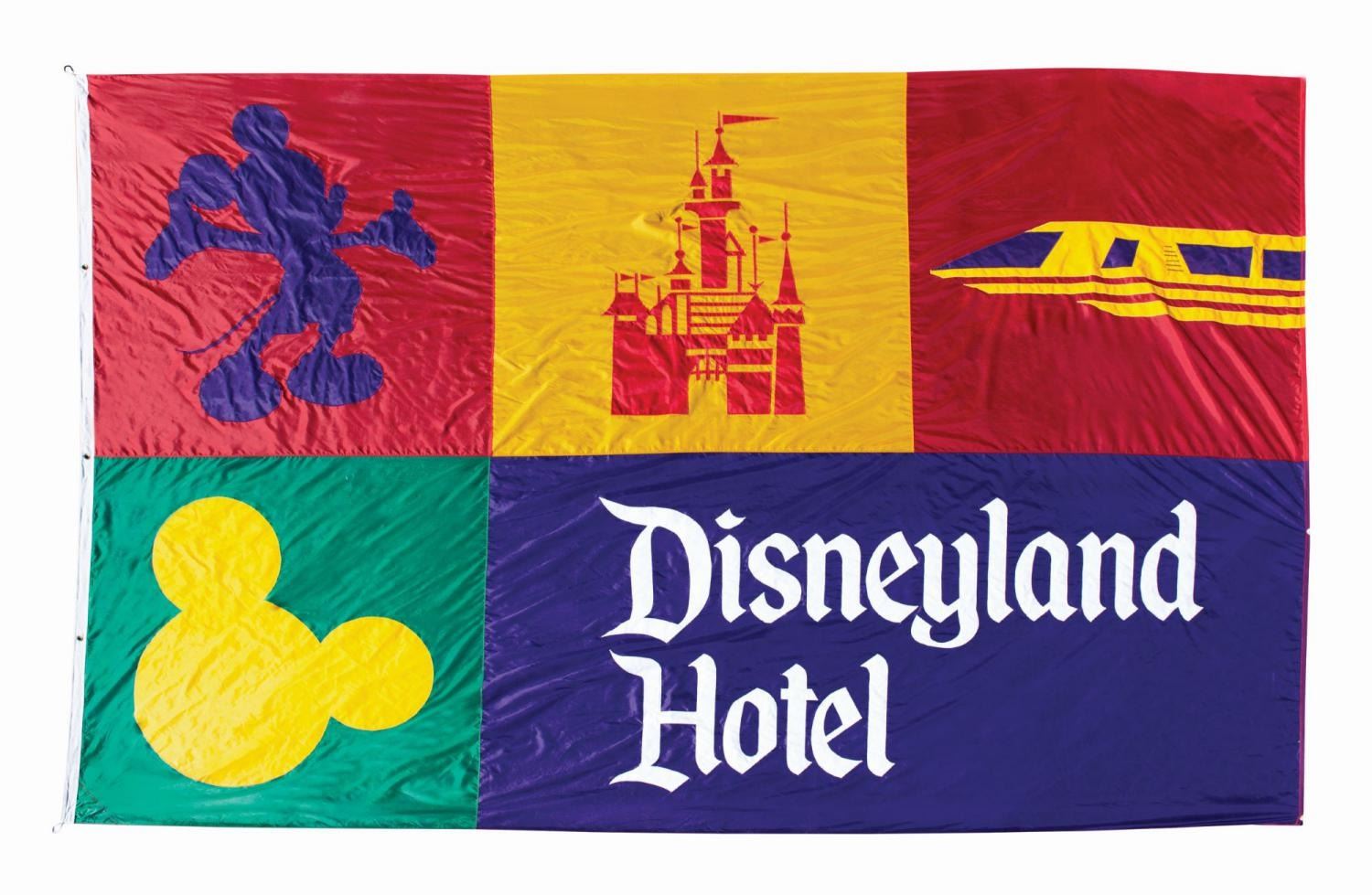 (Disneyland Hotel, c.1990s) This one-of-a-kind heraldry-style flag was commissioned for use with the Disneyland Hotel's large entrance flagpole, during a period of massive renovation, occurring after the Walt Disney Company's acquisition of the Disneyland Hotel. The stunning large flag features indicia of Disneyland Resort; custom symbols and representations of Mickey Mouse, Sleeping Beauty Castle, and the Monorail, along with the text "Disneyland Hotel" displayed in font traditionally associated with Disneyland Park logotype. Alas, an alternate design was flown, but this artifact survives as a wonderful testament to the history Disneyland Park banners and local wholesaler Pageantry World's long association with the Disneyland Hotel. Measuring an impressive 10ftx15ft, the flag is in very good condition with minor surface and edge wear.