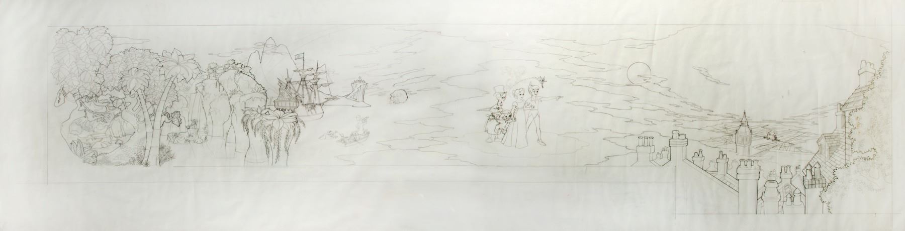 (Disneyland, 1982) A large original drawing created for the 1982 renovation of the "Peter Pan's Flight" attraction. This drawing was created for the entrance mural, and features the central characters and locations in the attraction. This finely detailed drawing features small in-progress adjustments, such as an erased image of Michael Darling floating in the air, which was altered to his current position next to Wendy. This artwork measures approximately 23"x79" and is in fine condition with minimal edge wear.