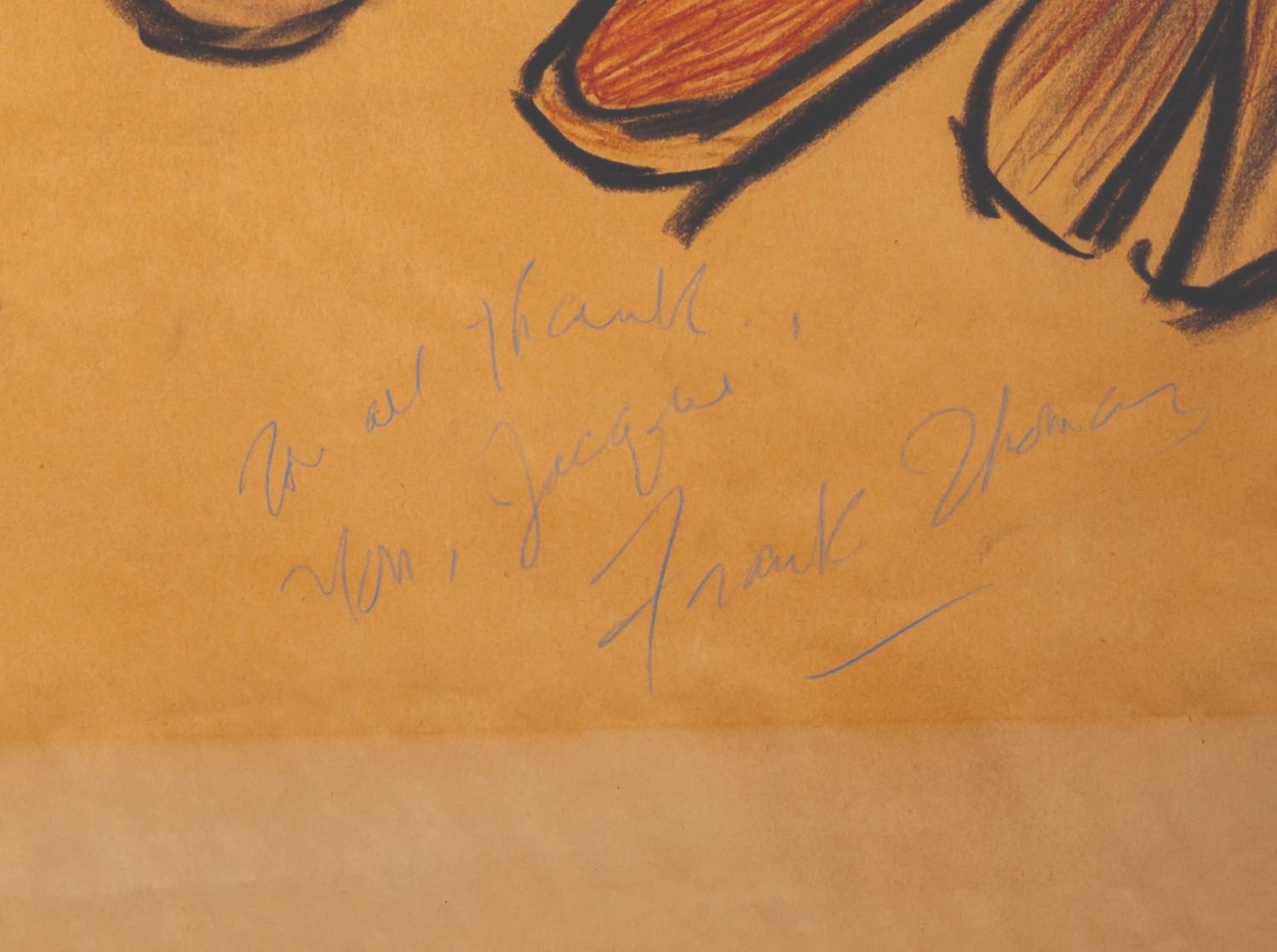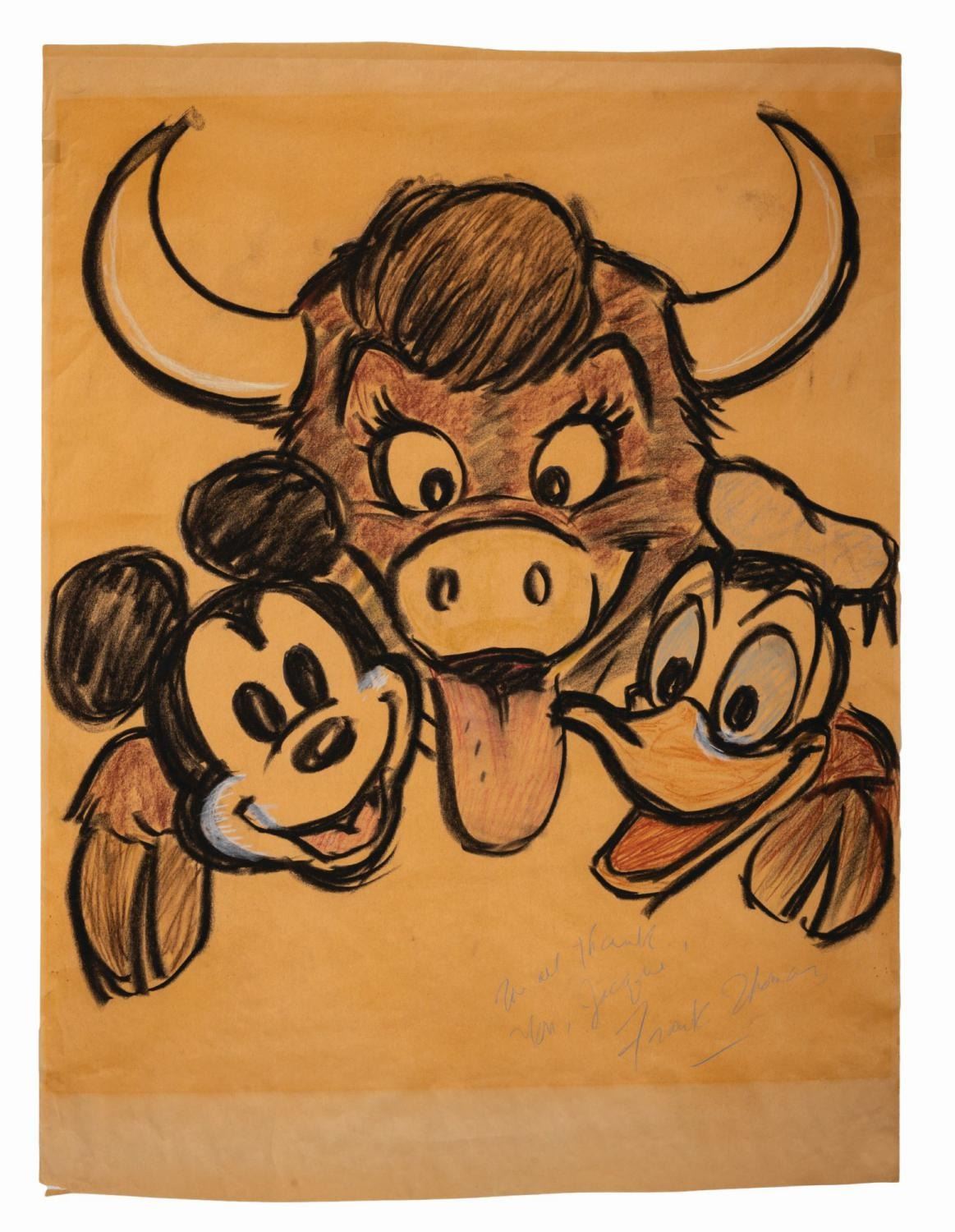 (Disney, c.1970s) A very large original drawing by Disney Legend Frank Thomas. One of Walt's "Nine Old Men," Thomas worked as an animator on such notable films as Snow White and the Seven Dwarfs, Pinocchio, Bambi, Alice in Wonderland, and many other in his over 50 years of service at the Walt Disney Studios. The drawing depicts Mickey, Donald, and Ferdinand, with a message from Thomas that reads, "We all thank you, Jacqui. Frank Thomas." Accomplished in pastels on a large 38"x28" sheet of thin paper, the drawing is in good condition with some yellowing to the paper from previous display in a frame, and a few small pin holes at the edges. There are a few pieces of tape at edges, and a piece of tape was used on the reverse to reinforce a small tear.