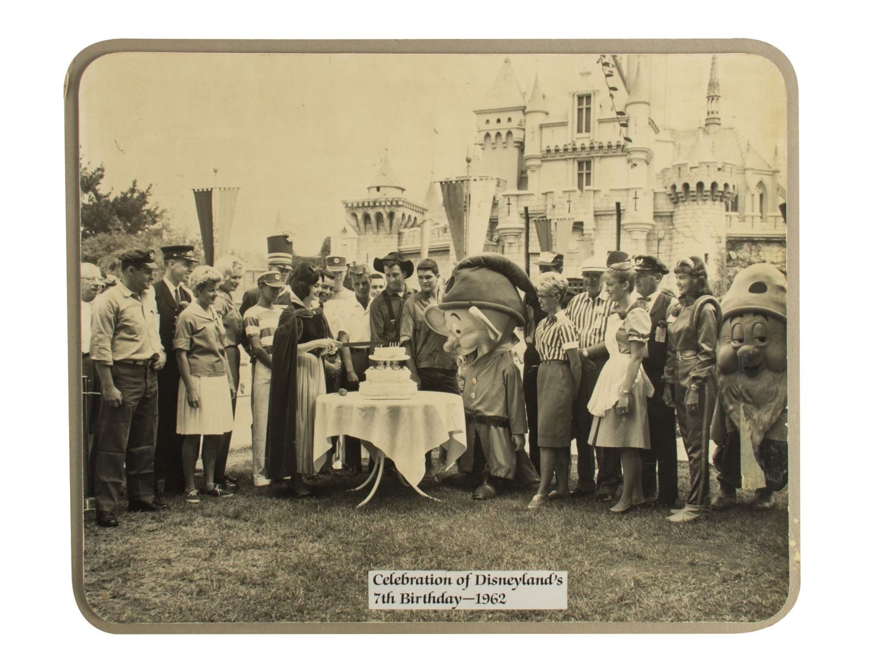 (Disneyland, c.1970s-80s) A large black and white photo of Disneyland's cast members and costumed characters celebrating the park's 7th Birthday in 1962. The photo shows Snow White cutting the Birthday cake in front of Sleeping Beauty Castle, with Dopey and Sleepy costumed characters, and cast members from many different park attractions. The photo is adhered to a rounded artist's board, which itself is adhered to another larger artist's board. This photo is believed to have been used in a promotional display for the park, and has the label "Celebration of Disneyland's 7th Birthday - 1962" at the bottom. Measuring 17"x21", the photo is in fair to good condition with some wear from age and use, including some lifting to the photo from its backing, and some tape wear to the right-edge of the photo.