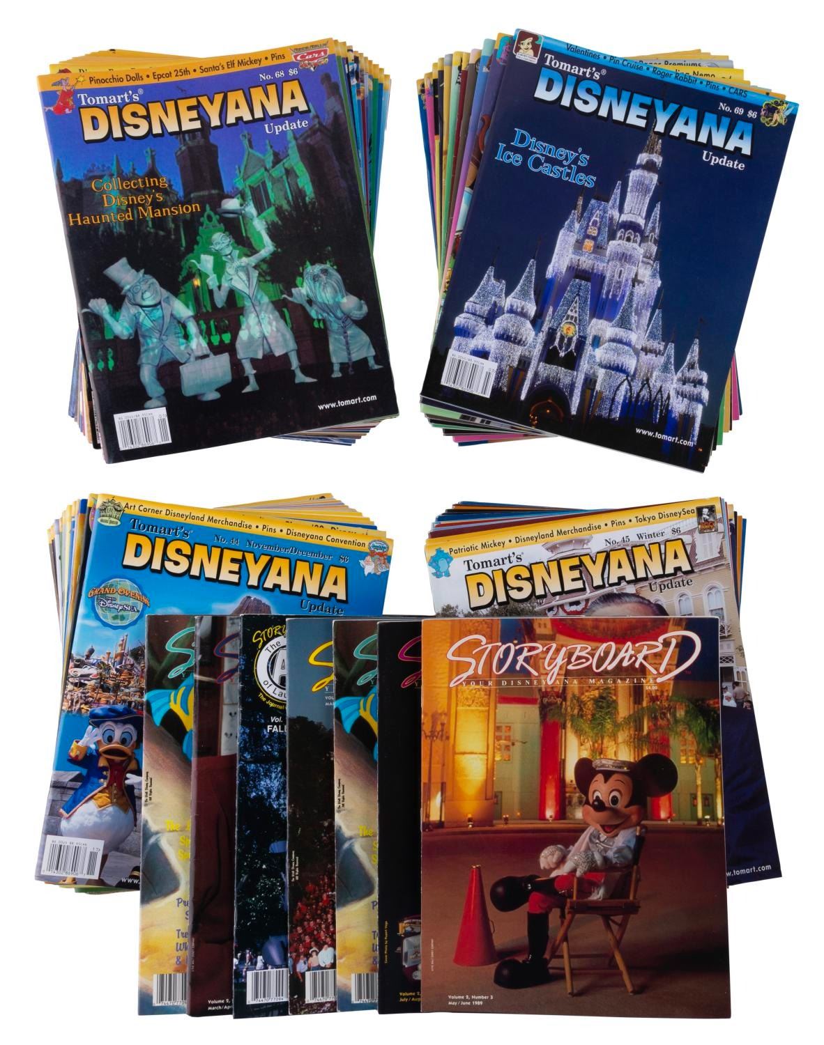 (Tomart/Bobit Publishing, 1990-2011) A large collection of Disneyana collectibles and animation magazines. Included are 52 issues of Tomart's Disneyana Update from issue #6 (1994) through issue #75 (2011); and 7 issues of Storyboard, a magazine about all things Disney, from March 1989 through Fall 1990. The magazines are in very good condition with typical wear from use and handling, and one duplicate issue in each title.