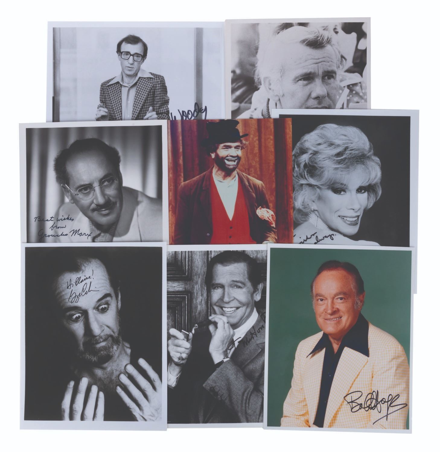 (Various, 1960s-1990s) A collection of (8) signed portraits of twentieth century comedy icons. The lot includes photos signed by Groucho Marx, George Carlin, Red Skelton, Milton Berle, Joan Rivers, Johnny Carson, Woody Allen, and Bob Hope. Personalized dedications are included on (3) of the prints. Each measuring 8"x10", the photos with autographs are in very good to fine condition.
