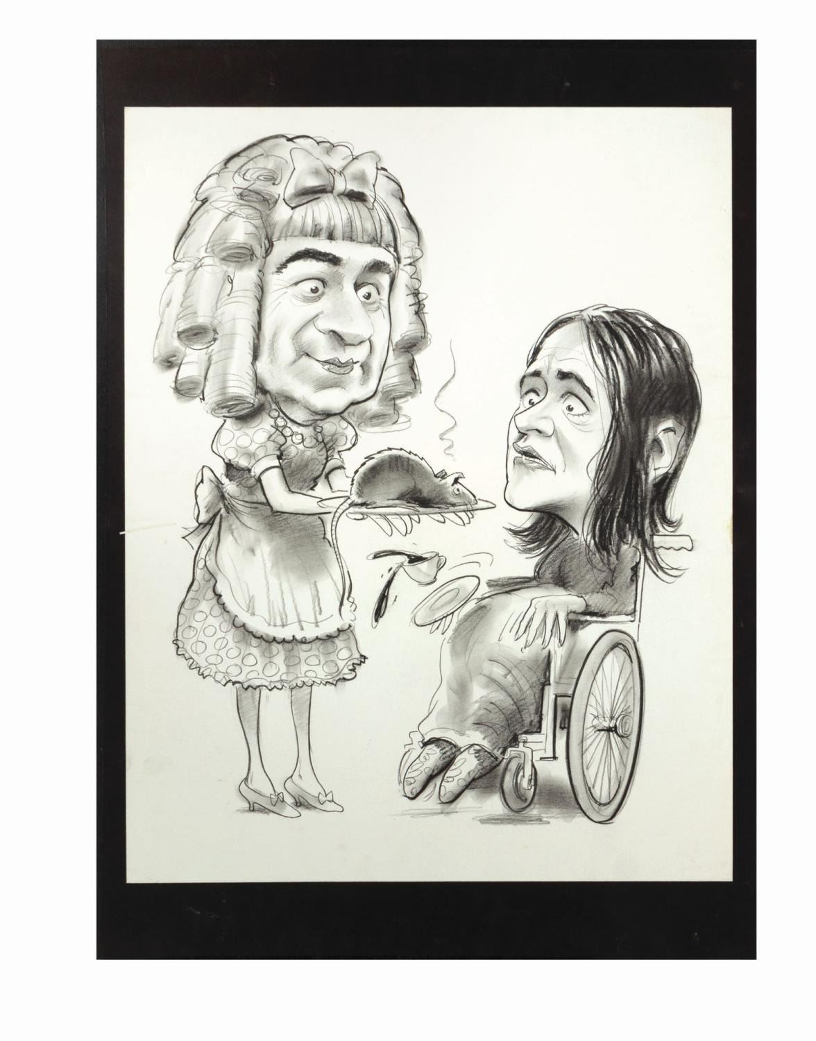 (MGM, 1981) An original drawing by renowned illustrator Peter Green depicting actors Jack Lemmon and Walter Matthau. This drawing was created by Green in a series of caricatures depicting Lemmon and Matthau as famous film duos. The series was used to promote Lemmon and Matthau's comedy film Buddy Buddy. In this drawing, Lemmon and Matthau are shown as Joan Crawford and Bette Davis in the film What Ever Happened to Baby Jane?. Accomplished in charcoal on art paper, the drawing has an image size of 22"x17.5" and is mounted to a 26.5"x19.5" sheet of foamcore. The condition is very good with little handling wear.