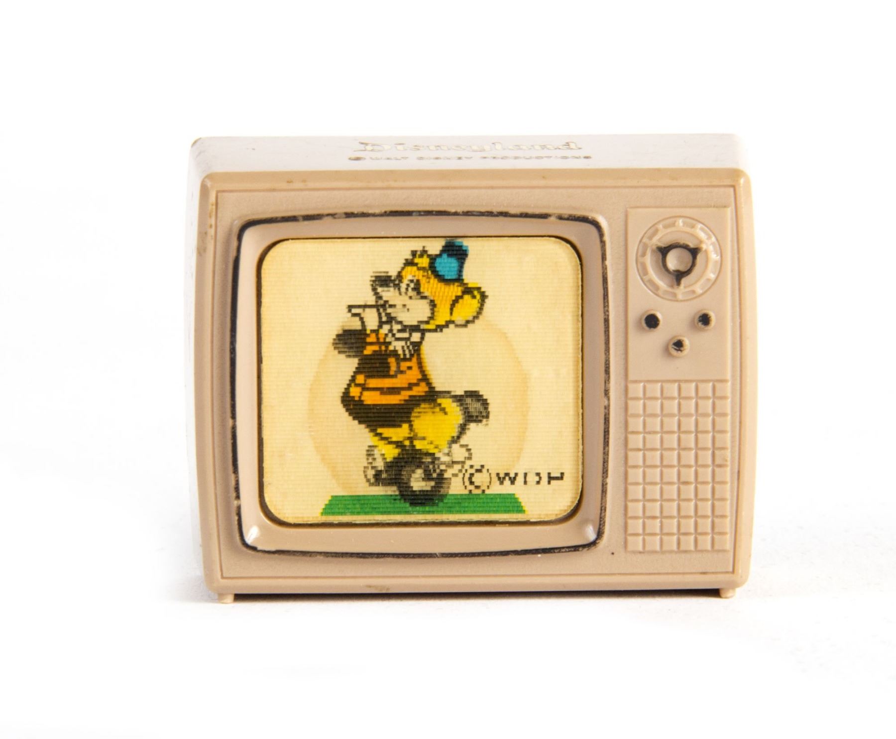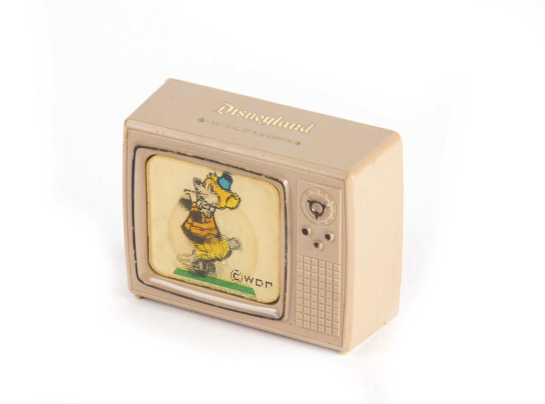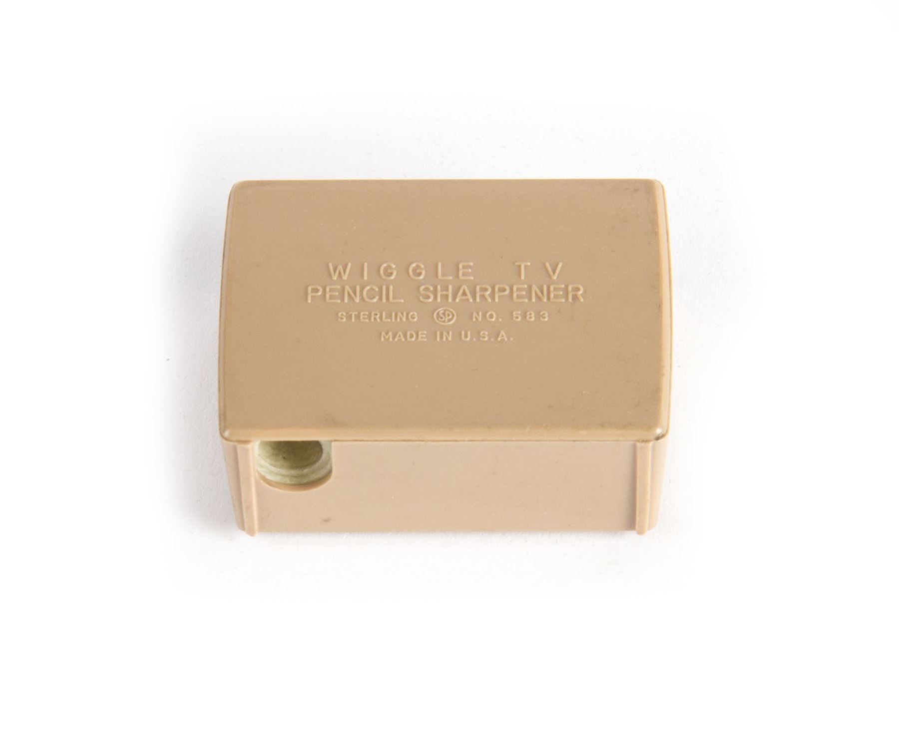 (Disneyland, c.1958) A souvenir pencil sharpener from Disneyland featuring a lenticular moving image of Bongo the Bear. Titled, "Wiggle TV Pencil Sharpener", this charming television-shaped pencil sharpener has the name "Disneyland" stamped along the top-edge in gold. Measuring 1.75"x2.25" and nearly 1" thick, the sharpener is in very good condition with minor wear from use.