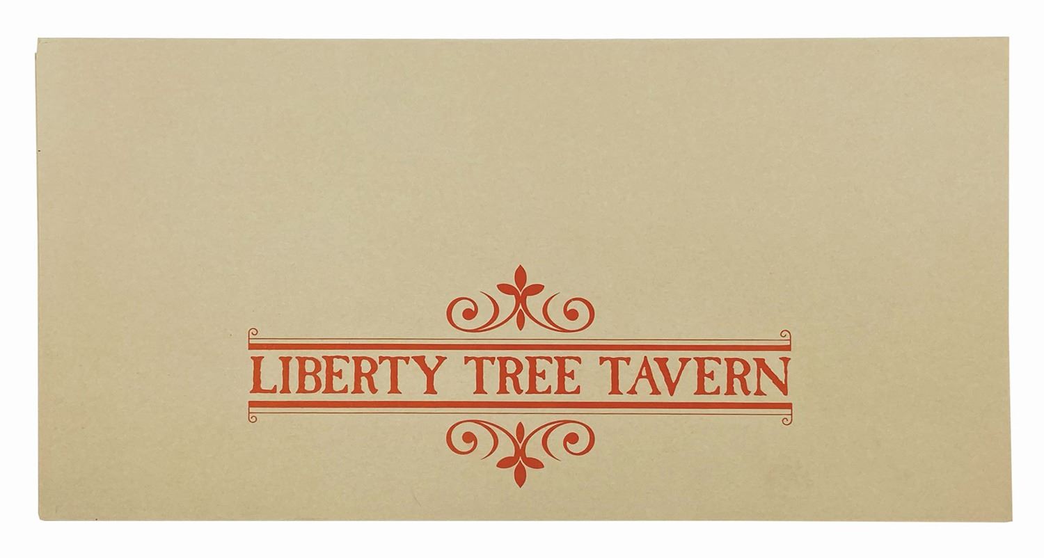 (Walt Disney World, 1979) A tri-fold lunch menu from Walt Disney World’s Liberty Tree Tavern in Liberty Square. Measuring 6"x12" folded, the menu unfolds to an impressive 18"x12". The condition is very good with minor wear.