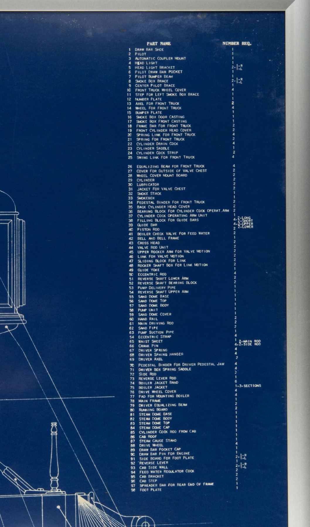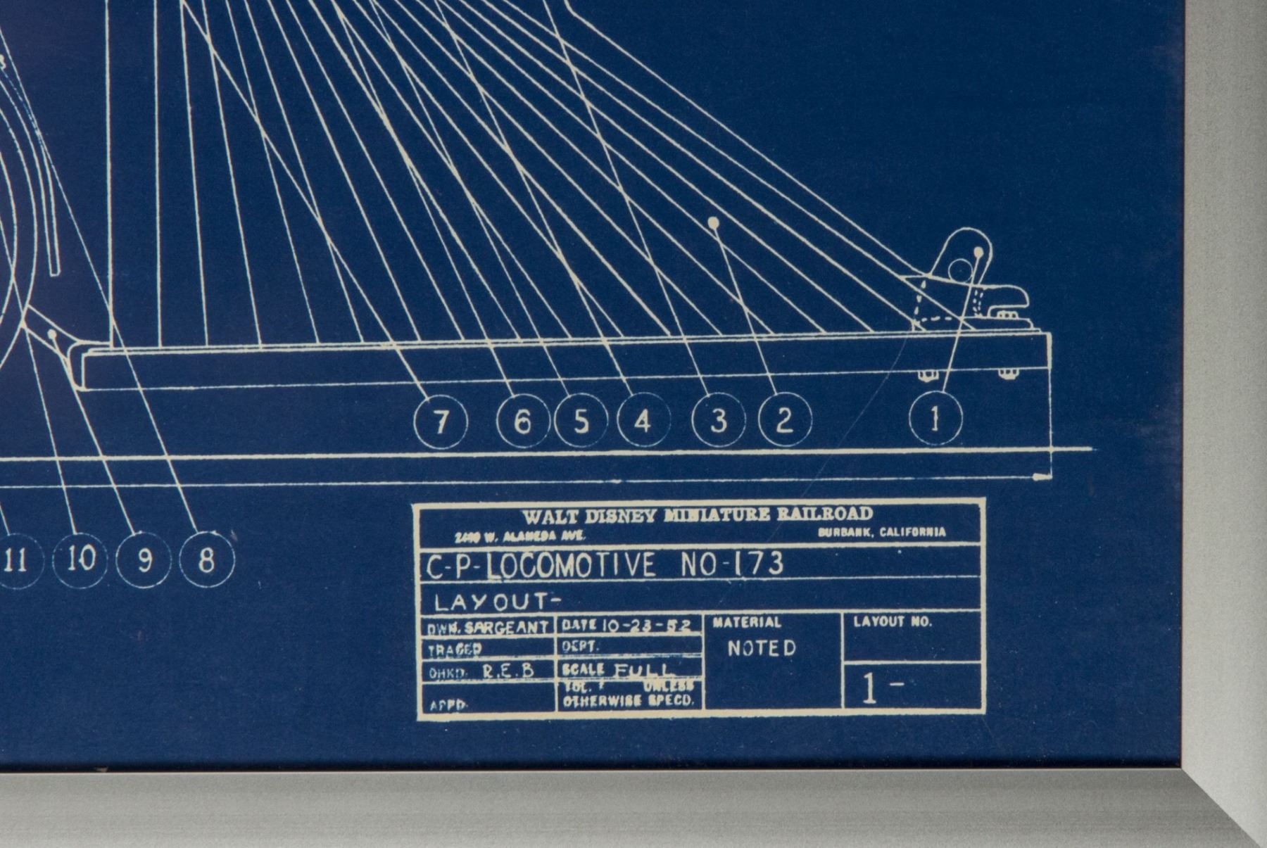 (Disney, c.1952/90s) A large full-size blueprint of Walt Disney's backyard steam powered train, the Lilly Belle. According to Rolly Crump, "When Disneyland's Administrative building was being rebuilt, there was a tunnel that visitors had to pass through to get to the new building. A designer working on the project wanted to decorate the tunnel using a series of historic Disneyland artwork. She went to Disney's Archives and located several important documents, including the blueprints for the Lilly Belle which were used to make this copy to display in the tunnel. When the project was finished, this Lilly Belle blueprint was left over and was given to me". This blueprint offers an incredible look at the Lilly Belle locomotive, and the original imagery is dated 10-23-52. The blueprint measures 29"x56.5" within its frame, and is in very good condition with minor wear from Crump's previous display.