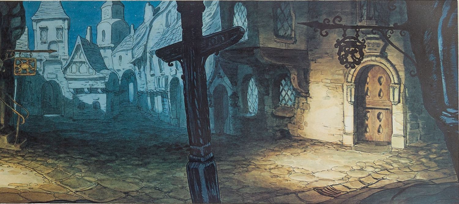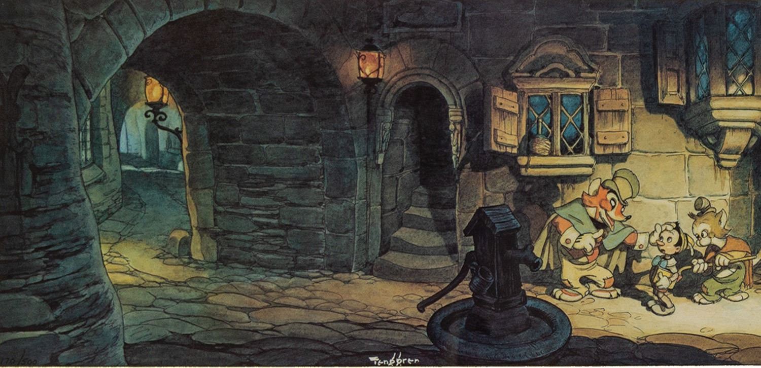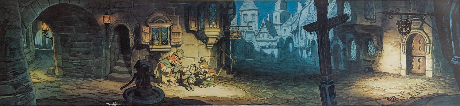 (Disney, c.1990s) A very rare limited edition print of Gustaf Tenggren's concept artwork for Pinocchio. This high-quality reproduction of Tenggren's original 1930s concept for Pinocchio has been masterfully presented in this custom frame with Pinocchio character molding. The artwork depicts Pinocchio and Honest John, and is number 170/500. The artwork measures 8.5"x39.25" within the 15.5"x46.5" frame, and is in very fine condition.