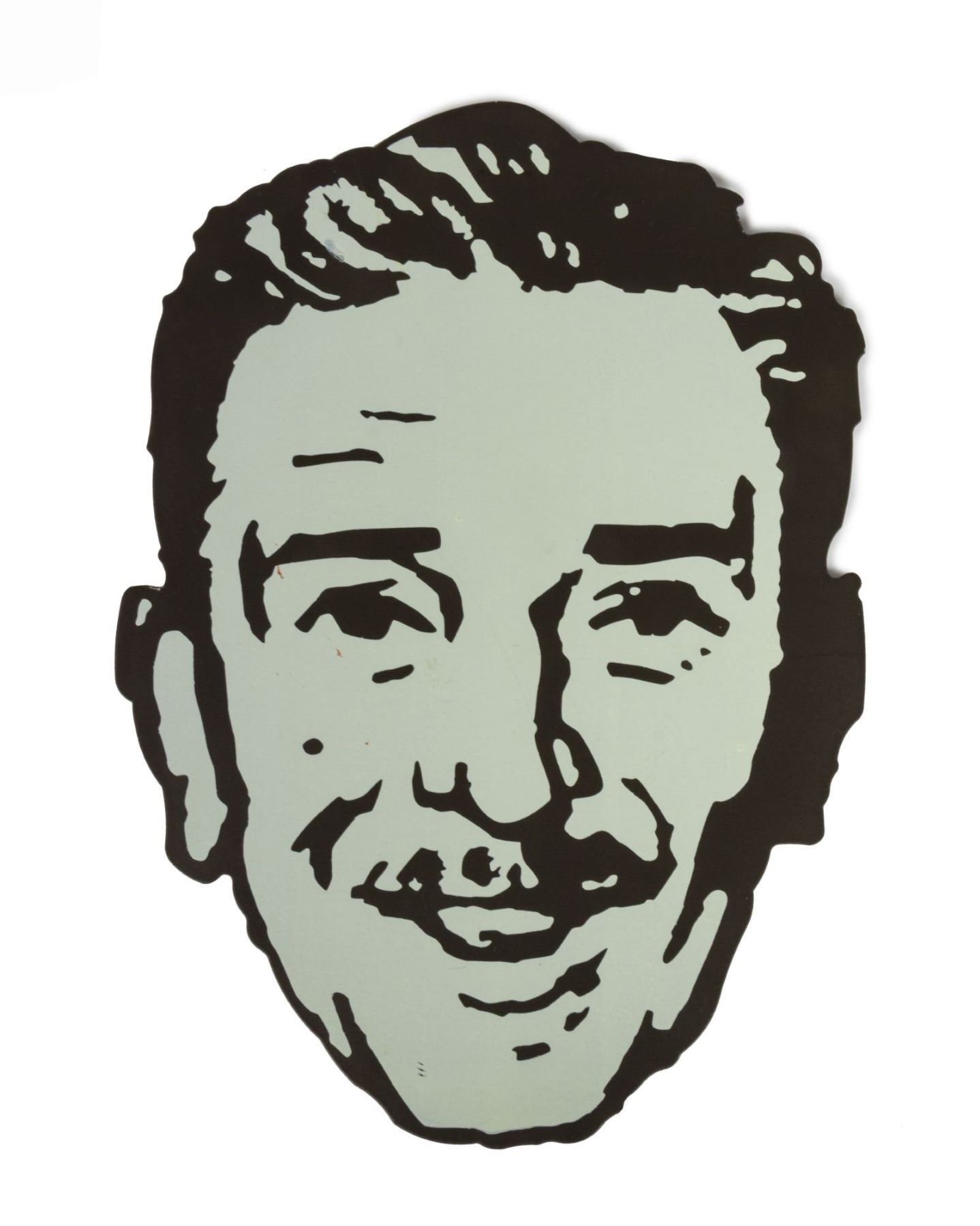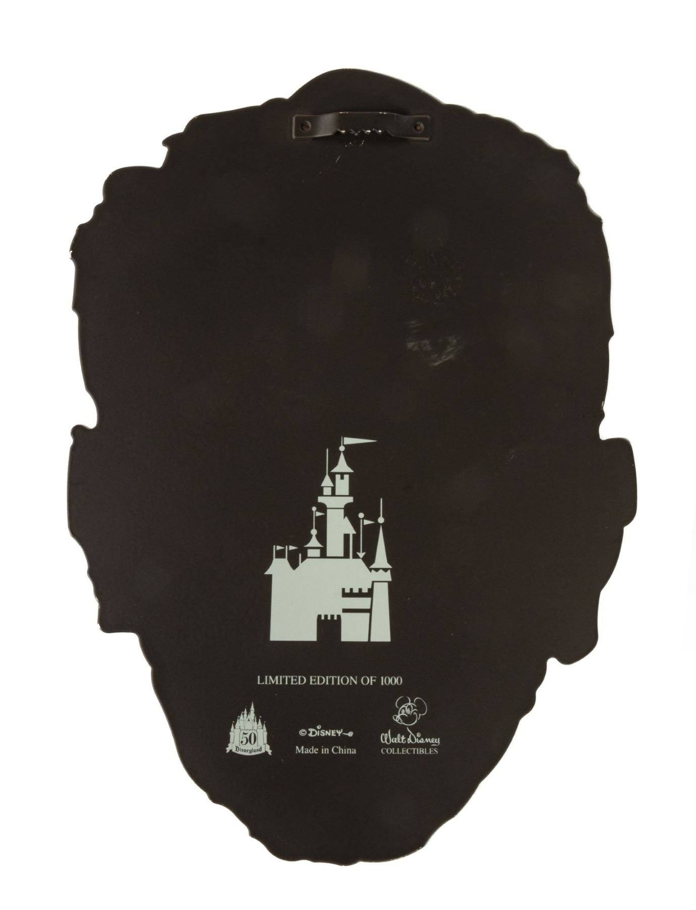 (Disneyland, 2005) A rare limited edition wall plaque featuring a stylized depiction of Walt Disney. The plaque was created by Kevin Kidney and Jody Daily for the 50th Anniversary of Disneyland, and was made in an edition of only 1000. The metal plaque measures 9.75"x7" and is in fair to good condition with some discoloration and small spots of chipping and scuffs to the surface and edges from previous display.