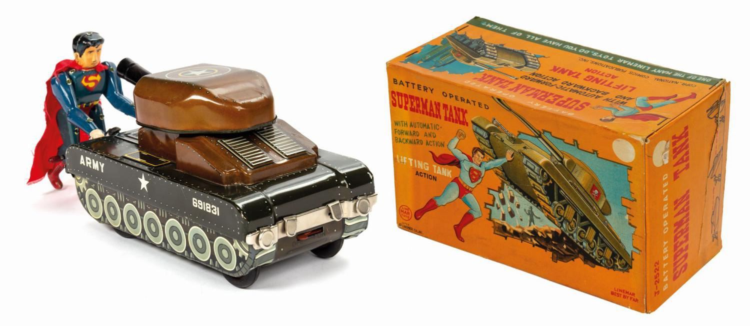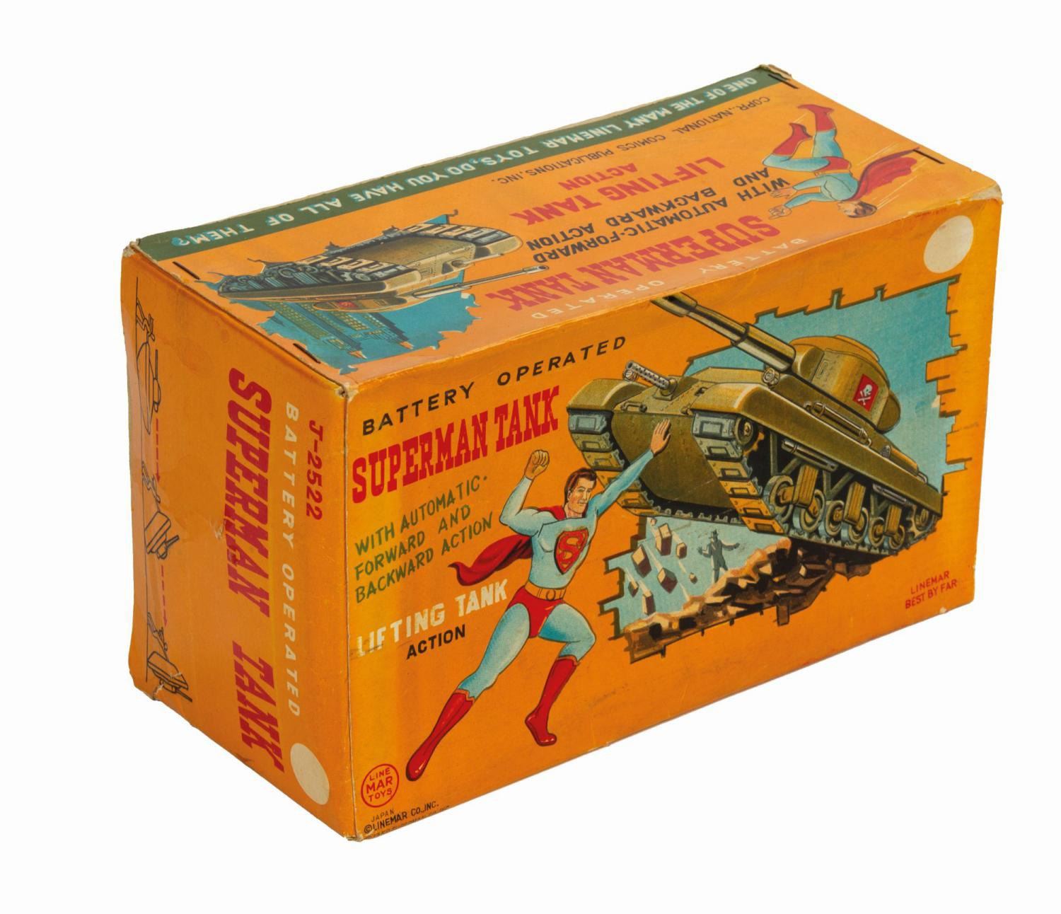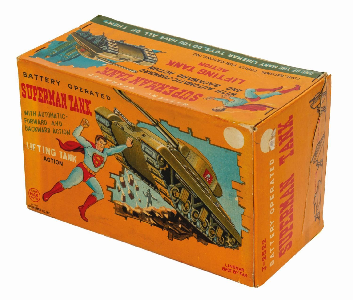 (LineMar, 1958) An extremely rare functioning Superman Tank toy by LineMar, a subsidiary of Marx Toys. The Man of Steel, depicted here in tin-litho, shows his enormous strength by lifting the battery-operated tank which moves forward and backward. The original box is included with great illustrated imagery and depictions of the toy's functionality. The toy measures approximately 11" long from the back of the tank to Superman's feet. It is in very good condition with minor surface wear from use including some spots of fraying to the seldom-included cape. There is some factory paint touch-ups to the front corner of the tank's body. The box is in very good condition with a few creases and surface wear.