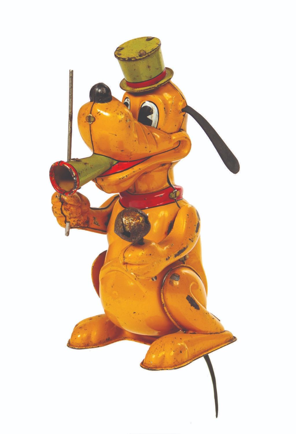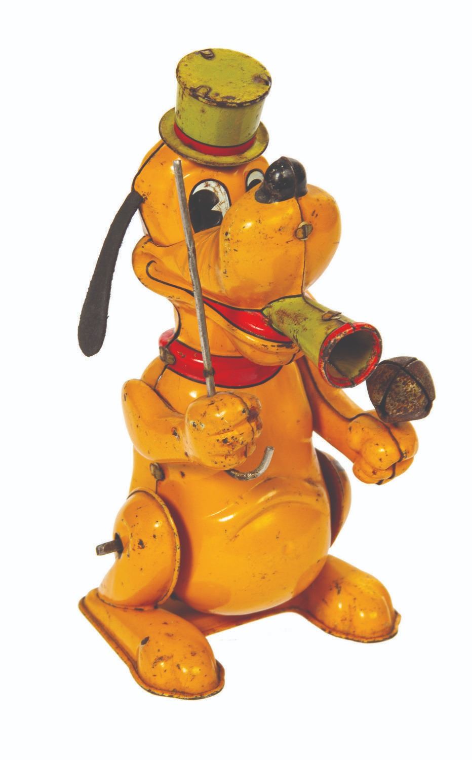 (Linemar, c.1950s) A vintage Pluto the Drum Major tin-litho wind-up toy manufactured by Linemar. When wound, Pluto is designed to rock on his feet while his arms move up and down, which rings the bell in his left hand as squeaking sounds issue from the horn in his mouth. The mechanicals are untested as the winding key is absent. The rubber tail and ear components, often missing on these toys, have been replaced with faithful replicas. Measuring 6"x3.5" and 4" deep, the piece is in fair to good condition, exhibiting nicks, rubbing, pitting, and surface loss with oxidation to the bell, horn, and hat. The pennant is missing from the pole in Pluto's right hand.