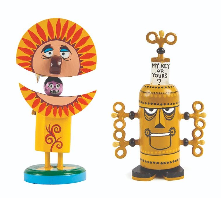 (1960s-70s) A pair of original "push-down" toys created and hand-painted by Rolly Crump. The toys include a lion which moved to reveal a person inside asking for help, and a key-creature which reveals a sign that says "my key or yours?". The toys measure 8" tall and 6.25" tall respectively, and are in good condition with some expected wear from age and minor repairs made by Rolly.