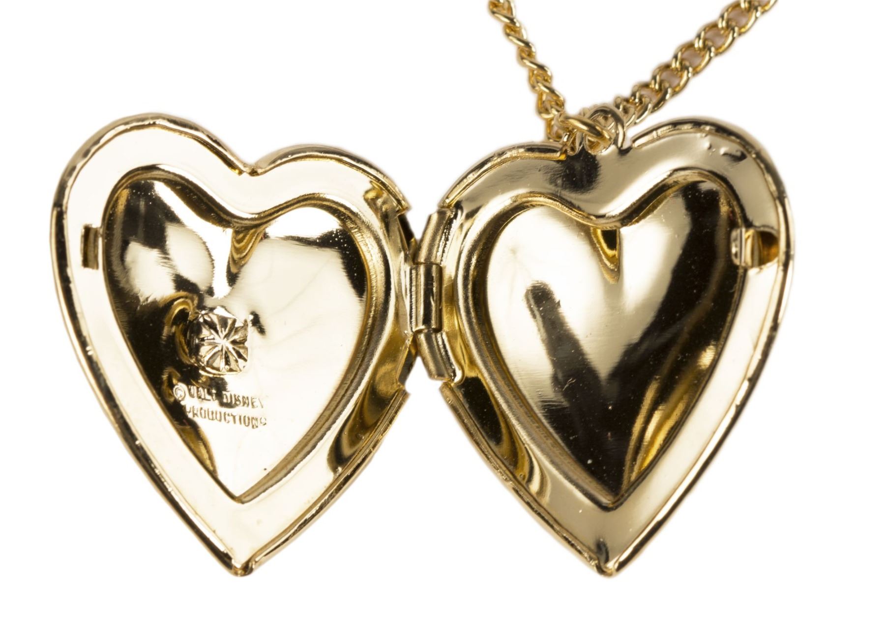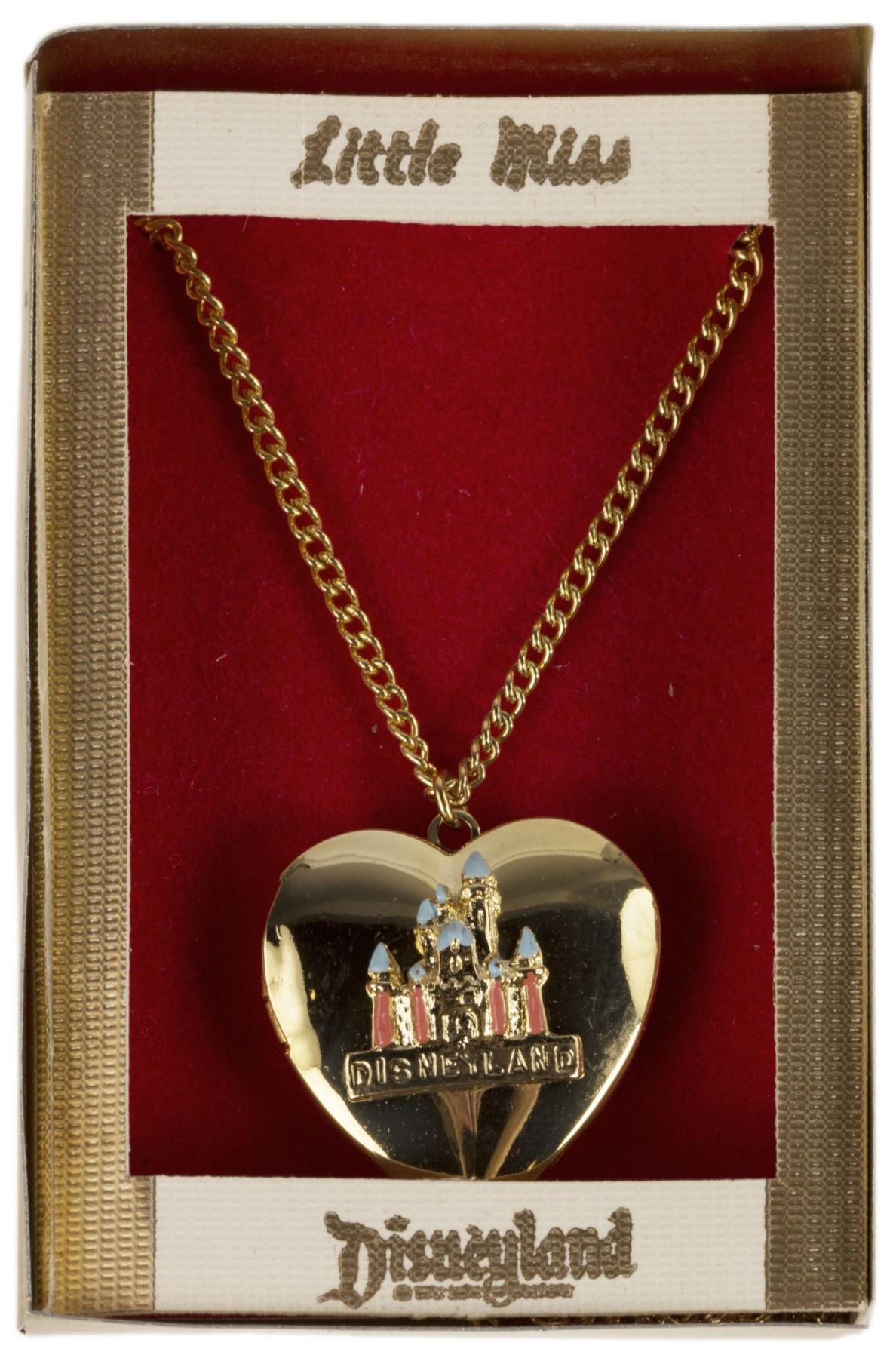 (Disneyland, c.1960s) A gorgeous heart-shaped gold locket with an image of Sleeping Beauty Castle on the front with hand-colored accents. This large locket appears to be unused, and is still in its original box. Measuring 3.25"x2.25" in the box, the locket is in very good condition with minor wear. The box is in good condition, with some tearing on the plastic sleeve and bending to the box.