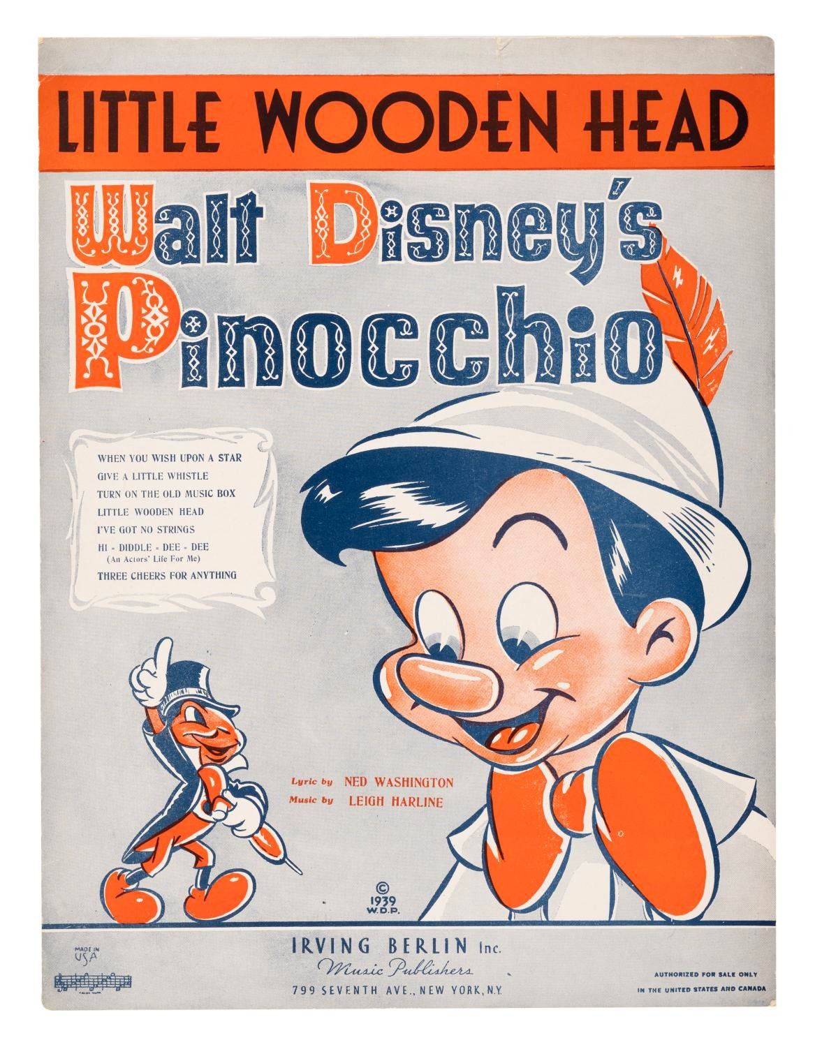 (Disney, 1940) Sheet music for "Little Wooden Head" from Walt Disney's "Pinocchio," with music by Leigh Harline and lyrics by Ned Washington. Measuring 9.25" x 12", this piece is in good condition with minor smudges, a 0.75" crease at the top edge, and overall discoloration and wear from age.