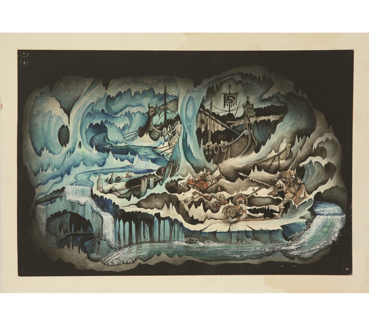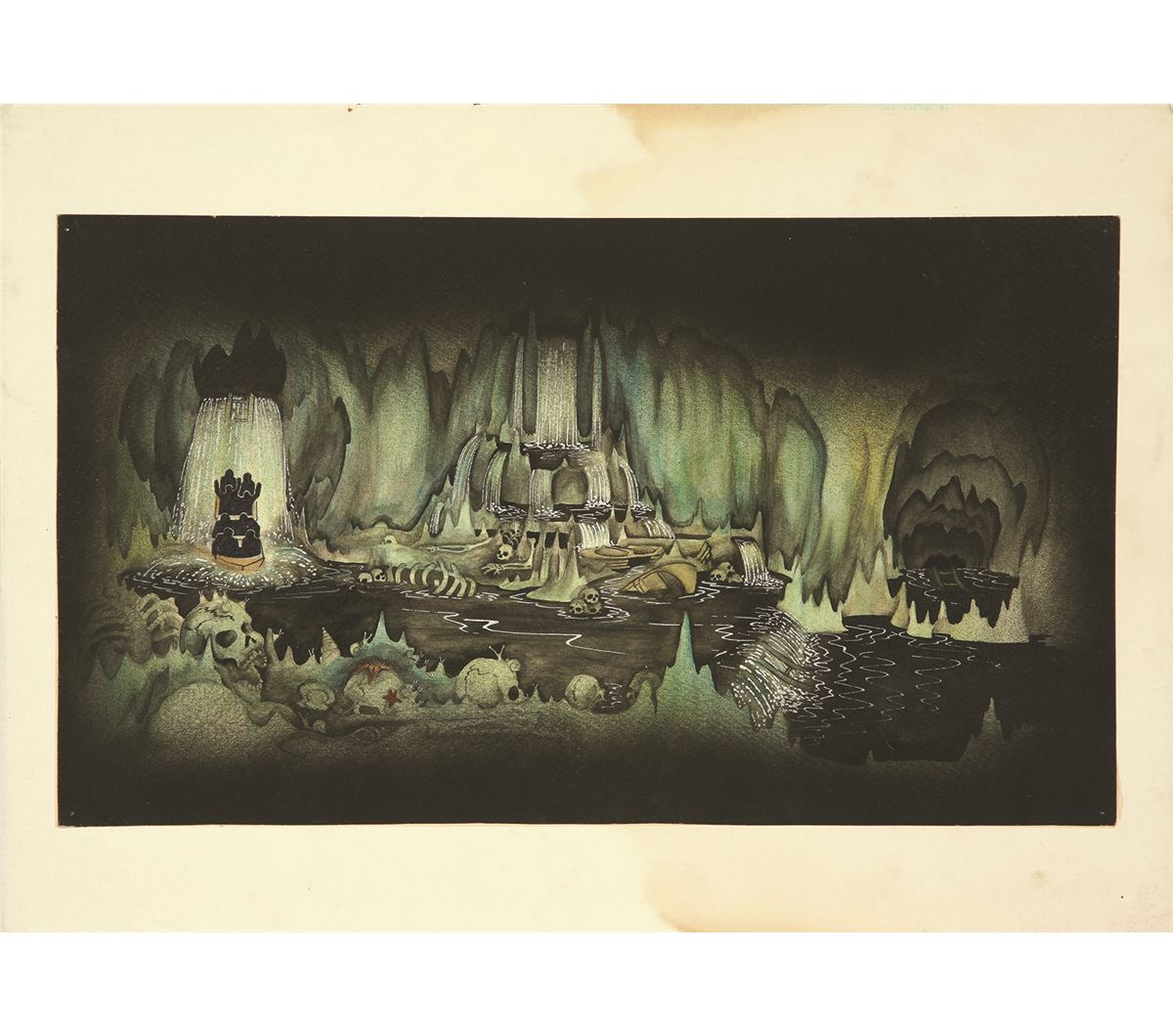 (Imagineering, 1989) Collection of (7) John Stone Imagineering development paintings for a Disney Roller Coaster attraction that was never produced. Accomplished in watercolor and ink on paper. They range in size from 9.5”x15” to 11.75”x17.5”. (4) paintings are mounted to illustration board. All are in very good condition with pin holes in the corners of four of them.